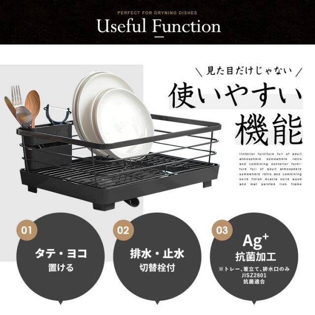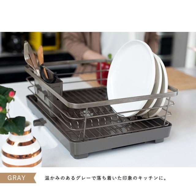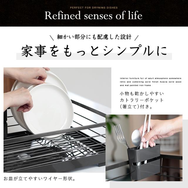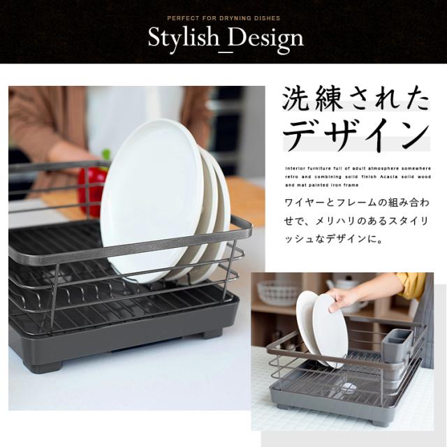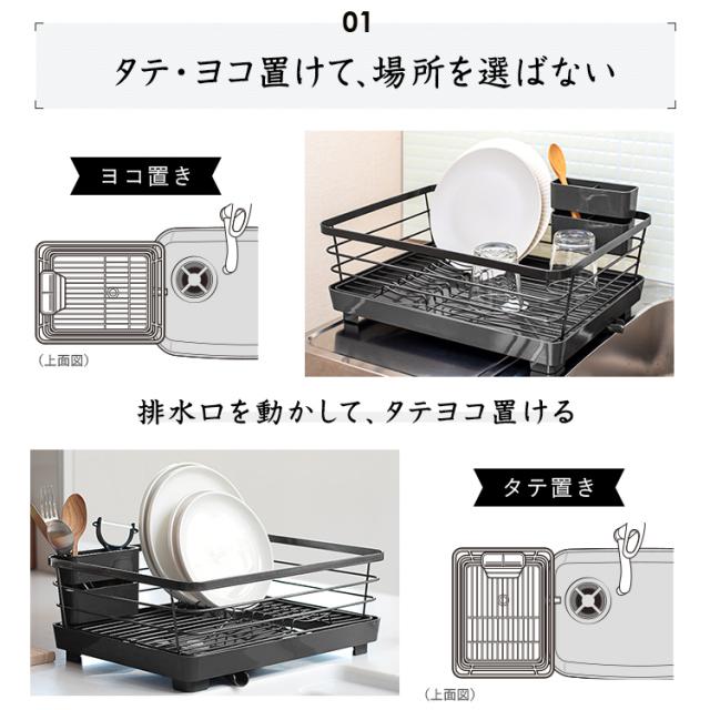 洗練されたデザインとカラーリングが高級感を演出。キッチンがお洒落になる水切りかご「ポゼ」。水が流れるトレーと排水口が付いているので、トレーに水が貯まりません。排水と止水を変更できる弁も付いています。排水口は可動式で、シンクに対して、横向きで縦向きでも、キッチンの広さに合わせて置けます。トレーは抗菌仕様で、いつでも清潔。小物を乾かすポケット、お皿を立てやすいワイヤー形状で、使い勝手も、見た目のデザインも優れた水切りかごです。たっぷり入る大容量ワイドタイプです。