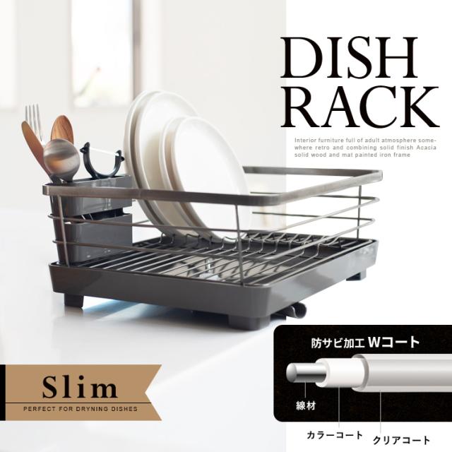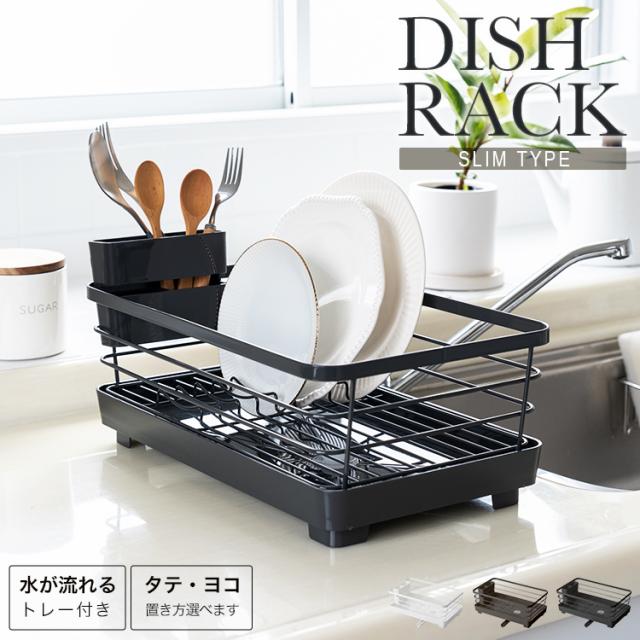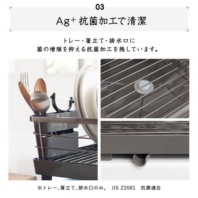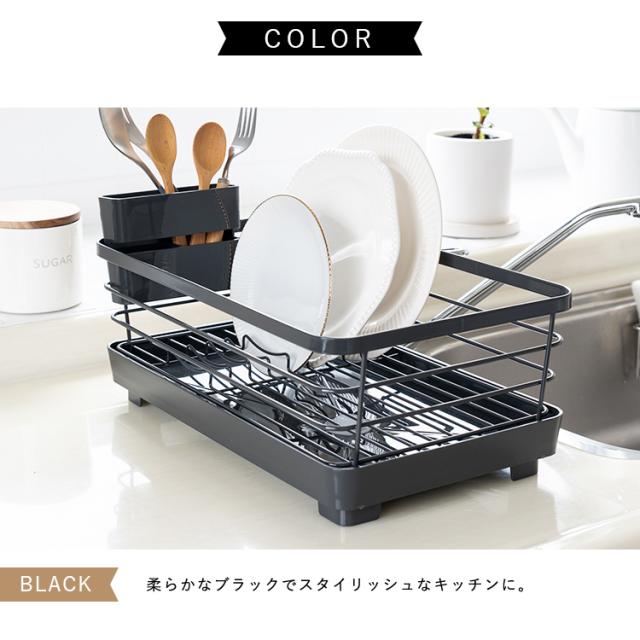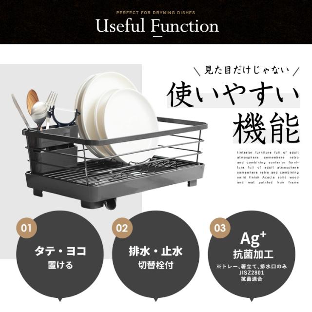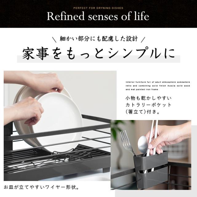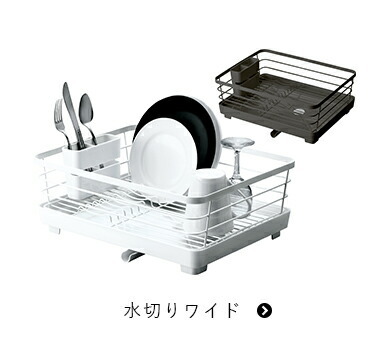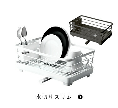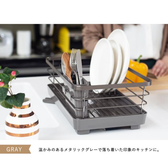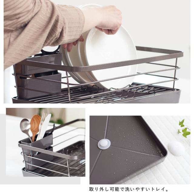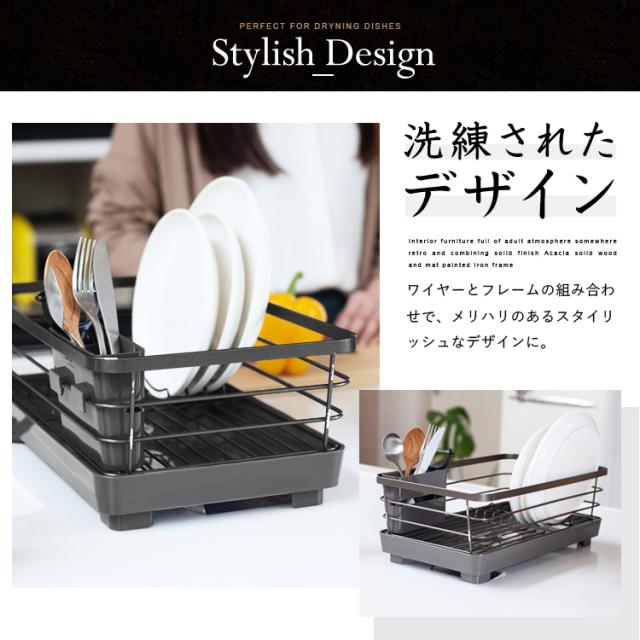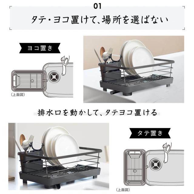 洗練されたデザインとカラーリングが高級感を演出。キッチンがお洒落になる水切りかご「ポゼ」。水が流れるトレーと排水口が付いているので、トレーに水が貯まりません。排水と止水を変更できる弁も付いています。排水口は可動式で、シンクに対して、横向きで縦向きでも、キッチンの広さに合わせて置けます。トレーは抗菌仕様で、いつでも清潔。小物を乾かすポケット、お皿を立てやすいワイヤー形状で、使い勝手も、見た目のデザインも優れた水切りかごです。場所をとらないスリムタイプです。