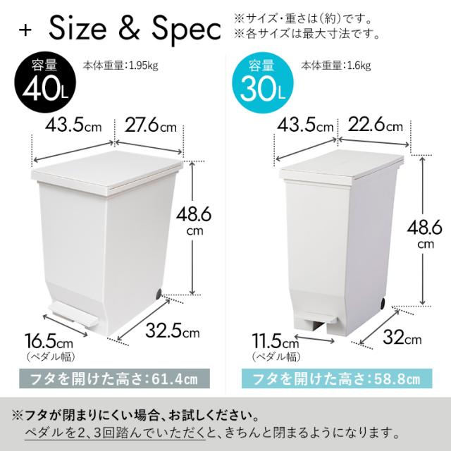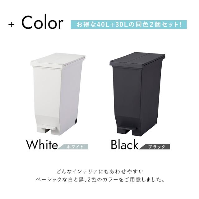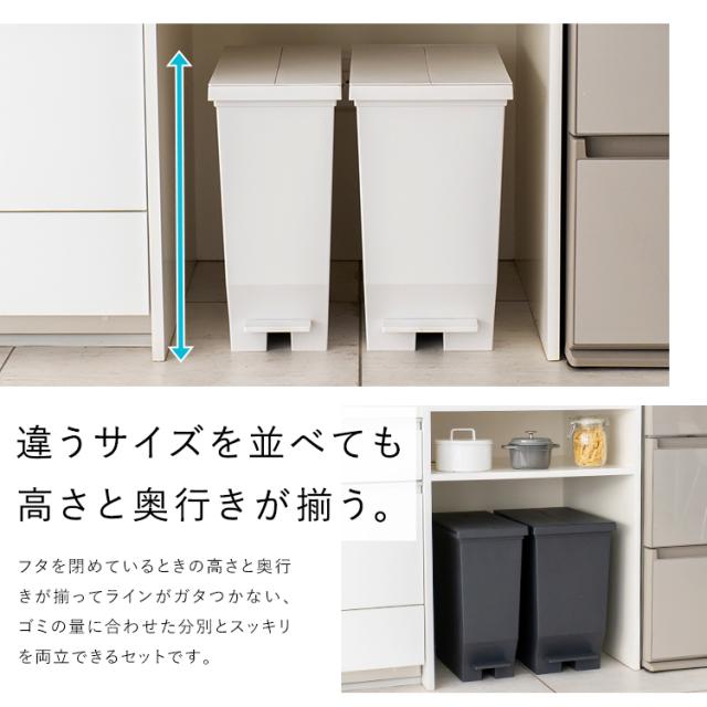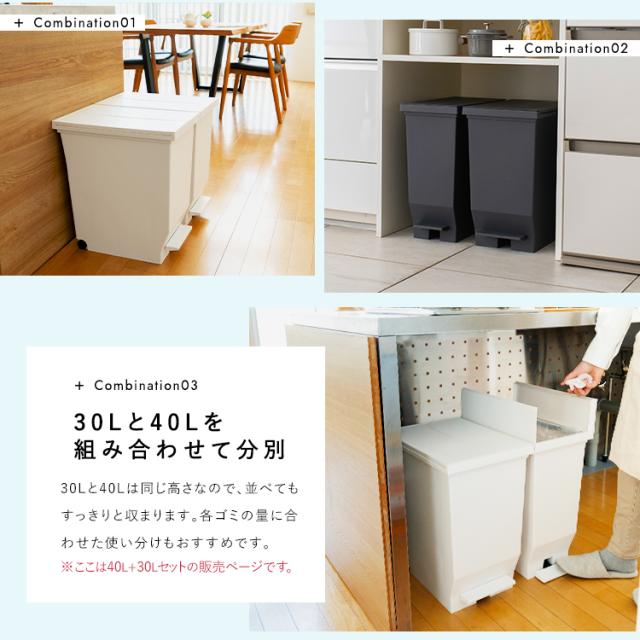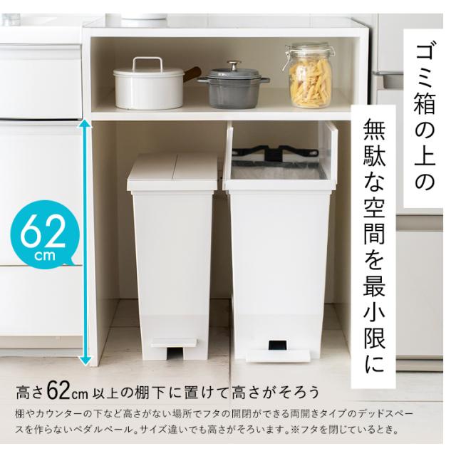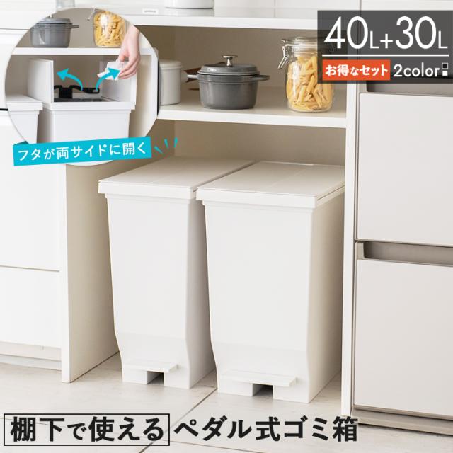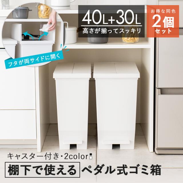 こちらは【30リットル1台&40リットル1台 2個セット】のページです。手を使わず、足で開閉できるペダルペール。フタが両方に開く構造でキッチンの収納ユニットにぴったり収まります。30リットルと40リットルの高さがぴったりなので、すっきり収まります。キャスター付きでゴミ箱の移動もラクラク♪ゴミ袋をセットできる袋止め付き。観音開き、両開きスタイルのフタが重なる構造なので、臭い漏れしにくいのも特徴です!容量 : 30リットル サイズ : 幅22.6×奥行43.5×高さ48.6cm(フタ開放時の高さ 約59cm)材質 : 本体・フタ・ポリ袋止め・ペダル・ロッド・キャスター=ポリプロピレン容量 : 40リットル サイズ : 幅27.6×奥行43.5×高さ48.6cm(フタ開放時の高さ 約62cm)材質 : 本体・フタ・ポリ袋止め・ペダル・ロッド・キャスター=ポリプロピレンいずれも日本製