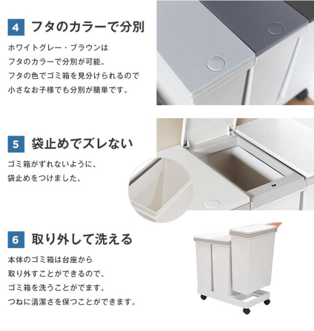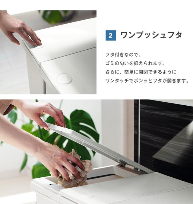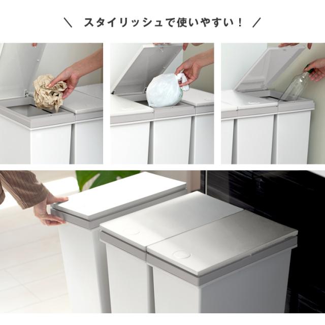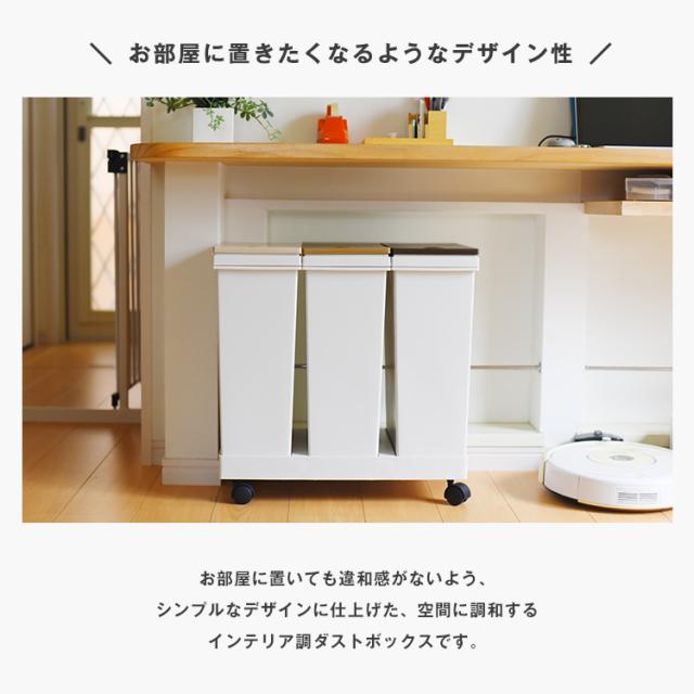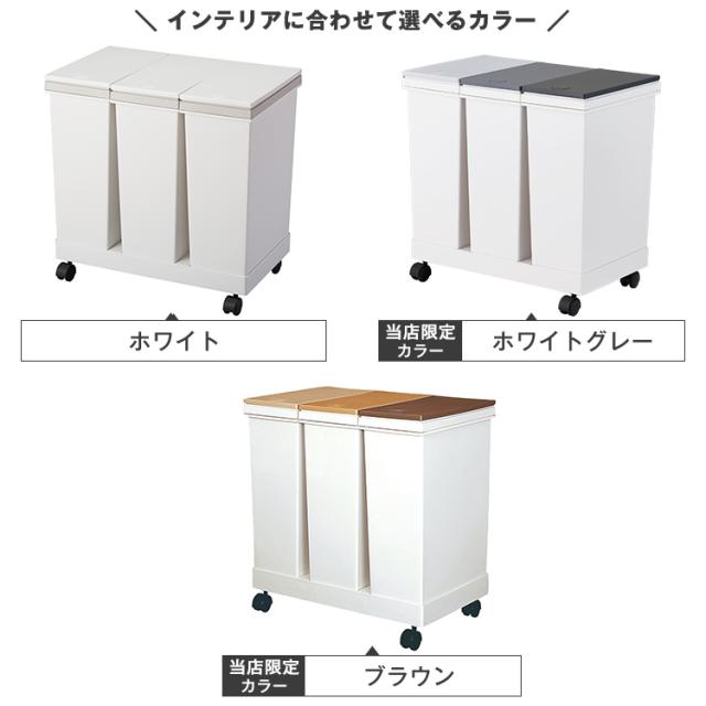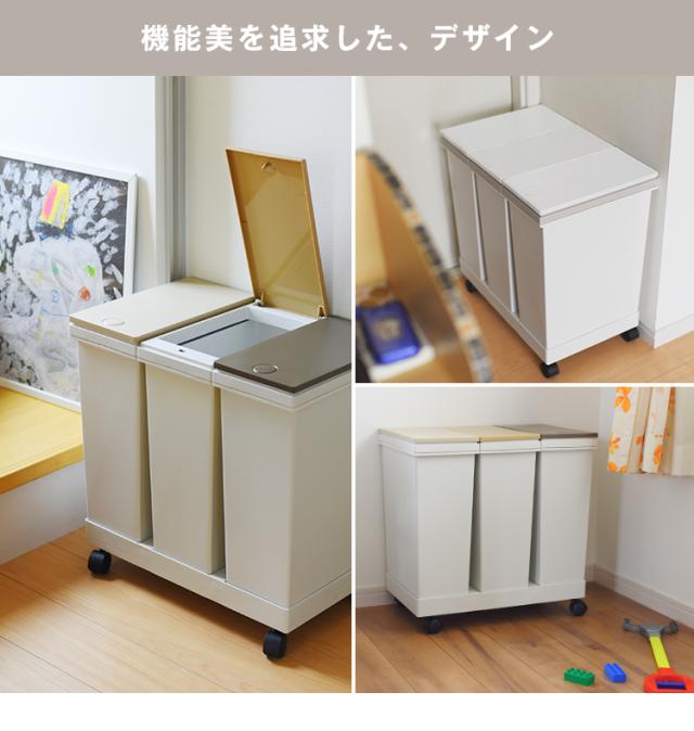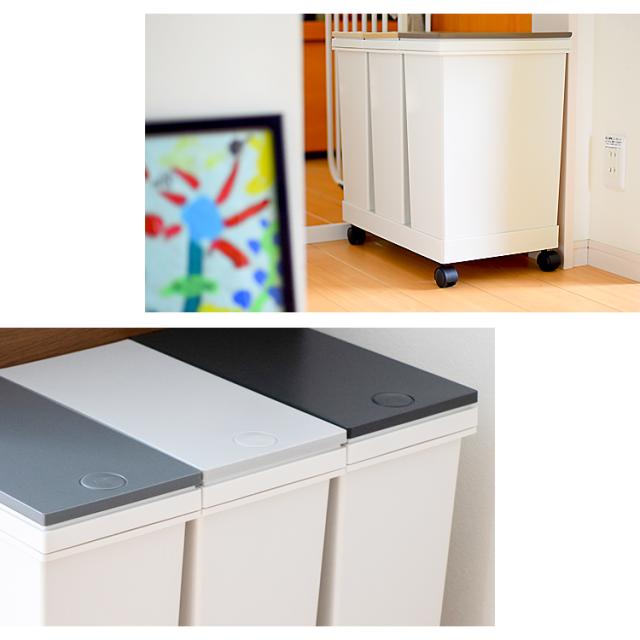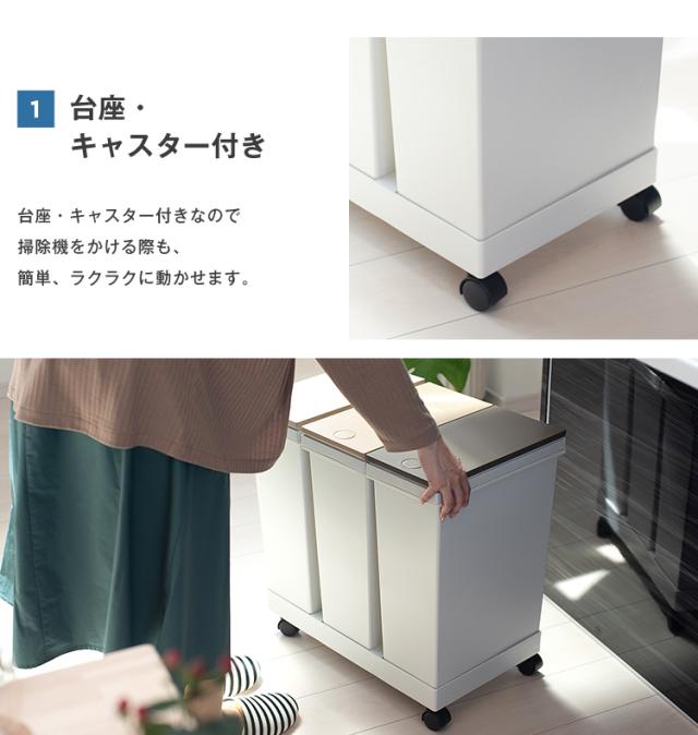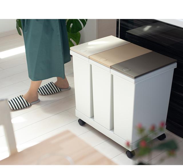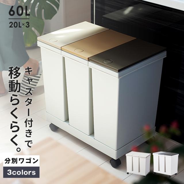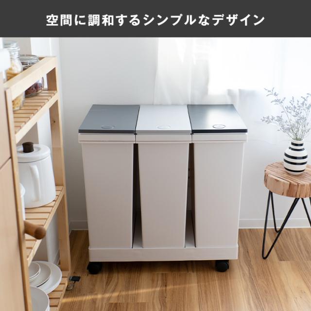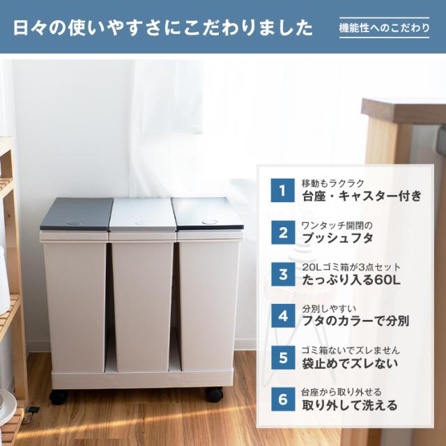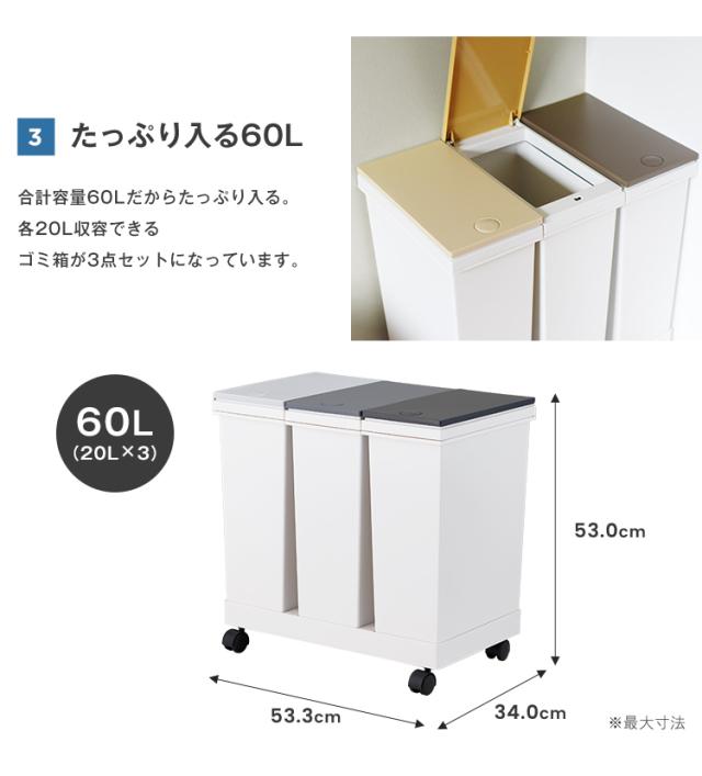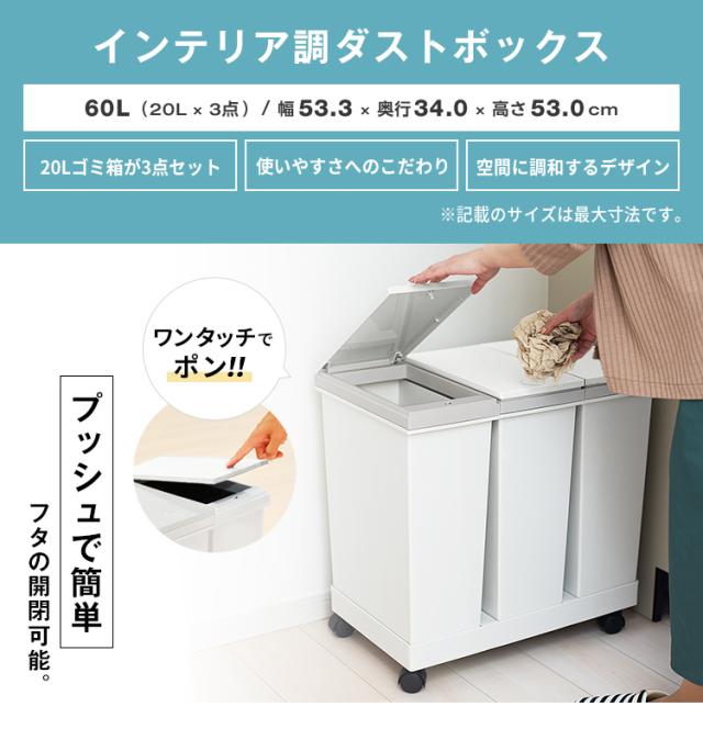 ワンタッチで開けられるプッシュ式。キャスター付きで、お掃除の際の移動もラクラク。3分別で空き缶やペットボトルの分別にも最適。たっぷり入る大容量60リットル 。スタイリッシュでお洒落なキッチンを演出します。容量 : 60リットル ( 20リットル × 3個 )サイズ : 幅53.3×奥行34.0×高さ53.0cm材質 : 本体・フタ枠・ポリ袋止め・台座=ポリプロピレン バネ=ステンレス鋼 キャスター=PP/PA日本製
