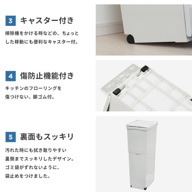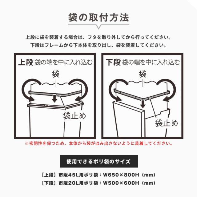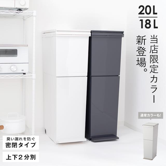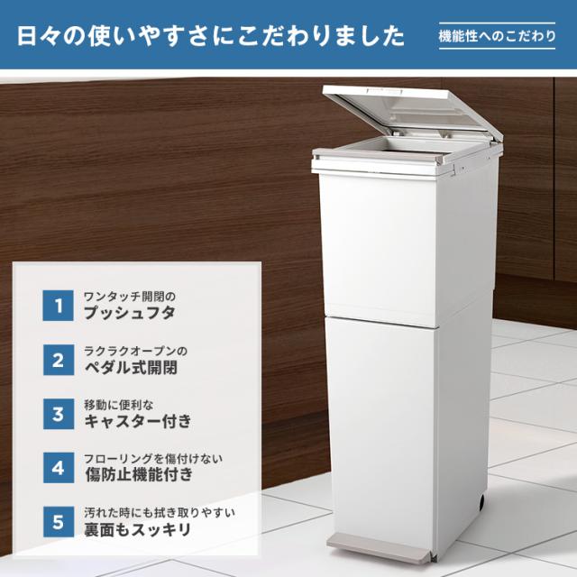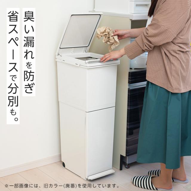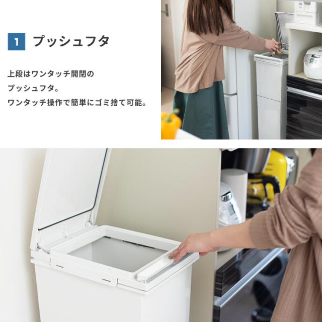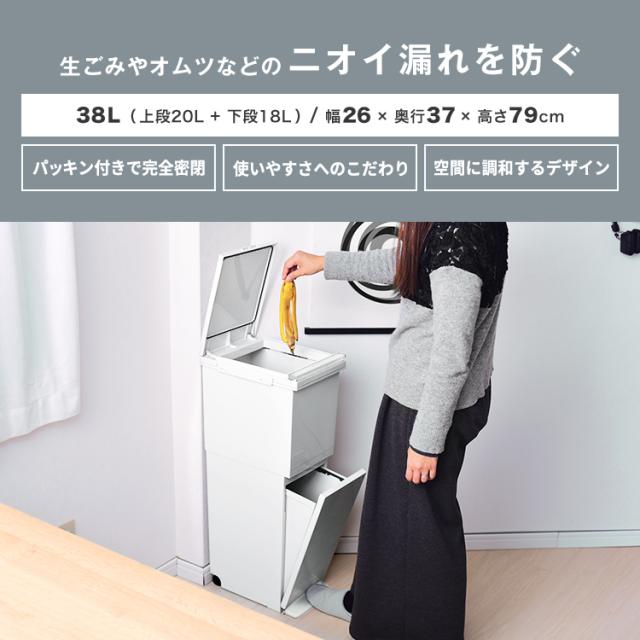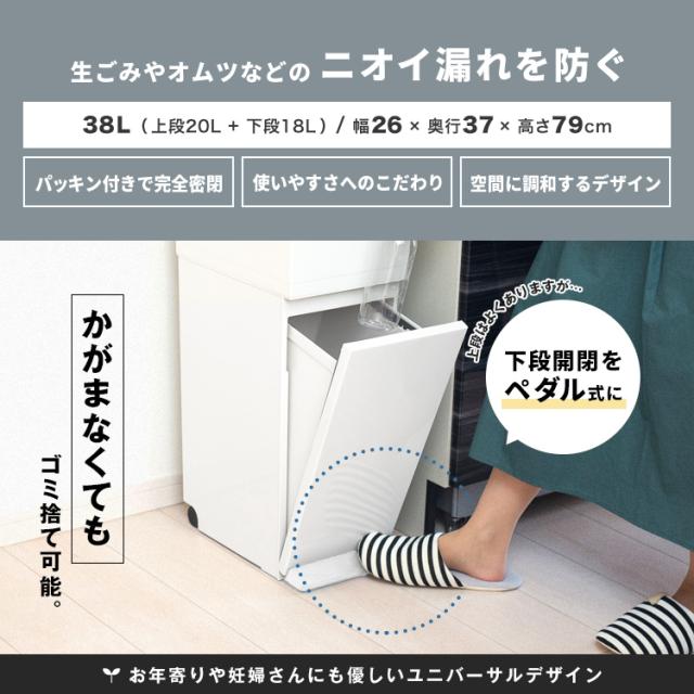 パッキン付きでゴミの気になる臭いを完全密閉。場所をとらないスリムな設計。上段はプッシュ、下段はペダルで開閉できます。移動もスムーズにできるキャスター付き。容量 : 38リットル ( 上段 20リットル 下段 18リットル )サイズ : 幅26.0×奥行37.0×高さ79.0cm材質 : フタ・上本体・下本体・フレーム・袋止め・キャスター=ポリプロピレン ペダル・プッシュレバー=ポリスチレン 下本体パッキン・スベリ止め=ポリエチレン フタパッキン=シリコーンゴム バネ=ステンレス鋼日本製