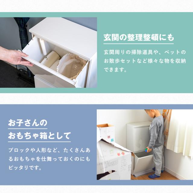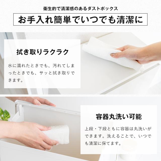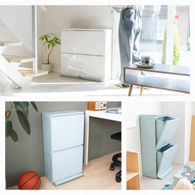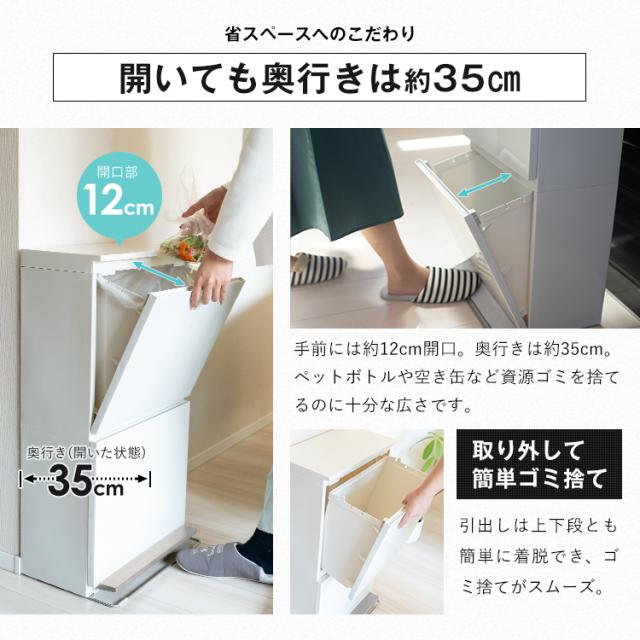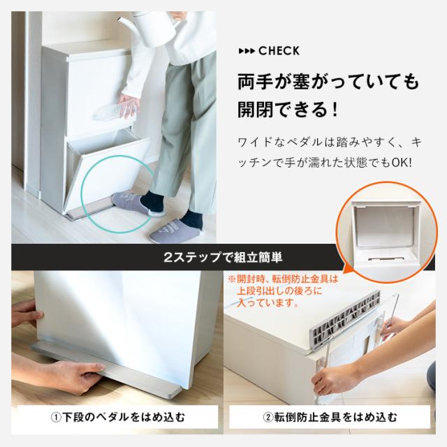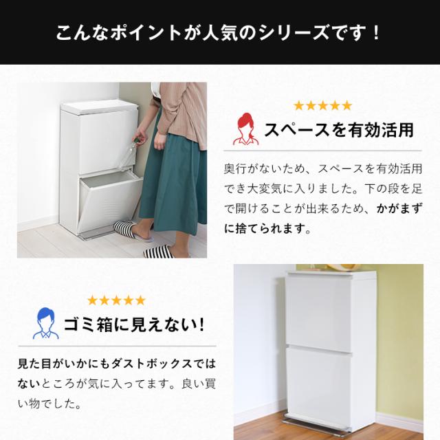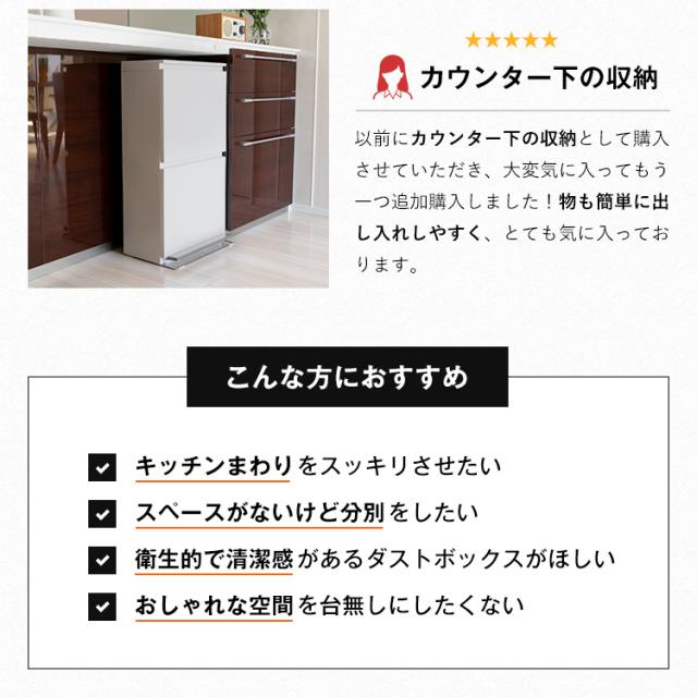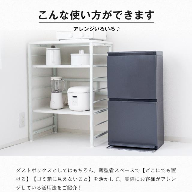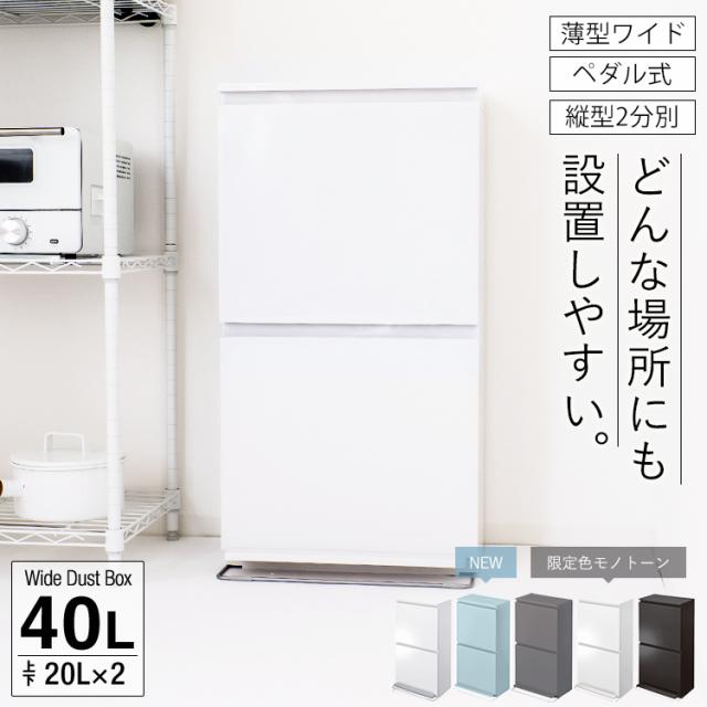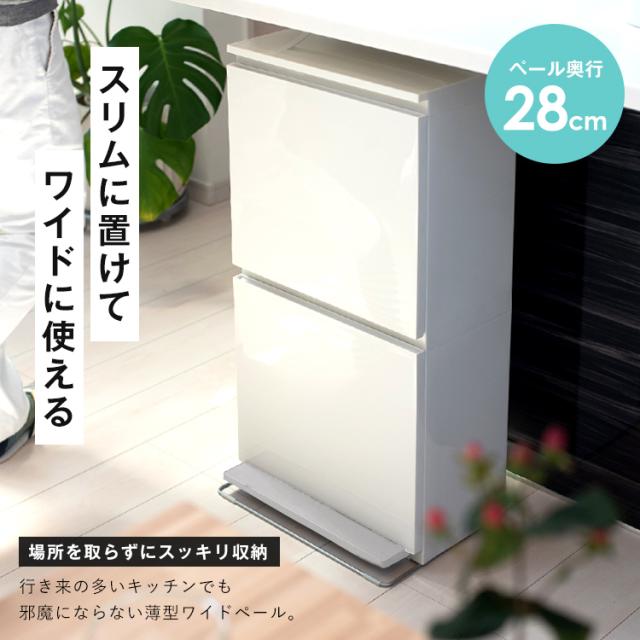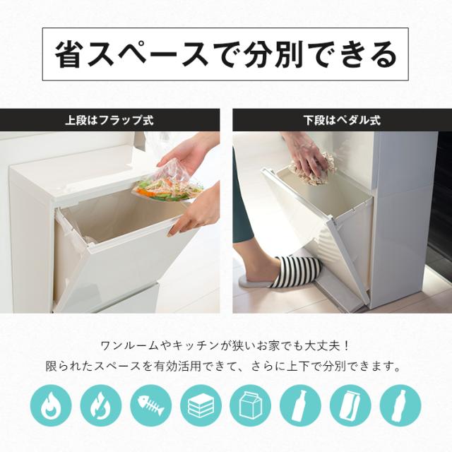 場所をとらない薄型ワイドタイプの分別。下段はペダルで開閉、転用防止パーツも付属。スタイリッシュな形状で、お洒落なキッチンを演出。収納ストッカーとしても、使用できます。容量 : 40リットル ( 上段 20リットル 下段 20リットル )サイズ : 幅40.0×奥行28.0×高さ76.0cm材質 : 天板・本体容器=ポリプロピレン ペダル=ポリスチレン スベリ止め=シリコーンゴム 転倒防止部品=スチール(樹脂コーティング)日本製