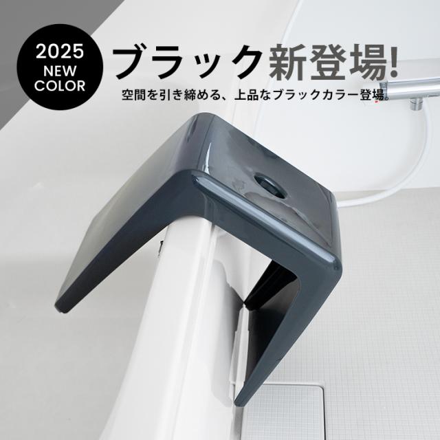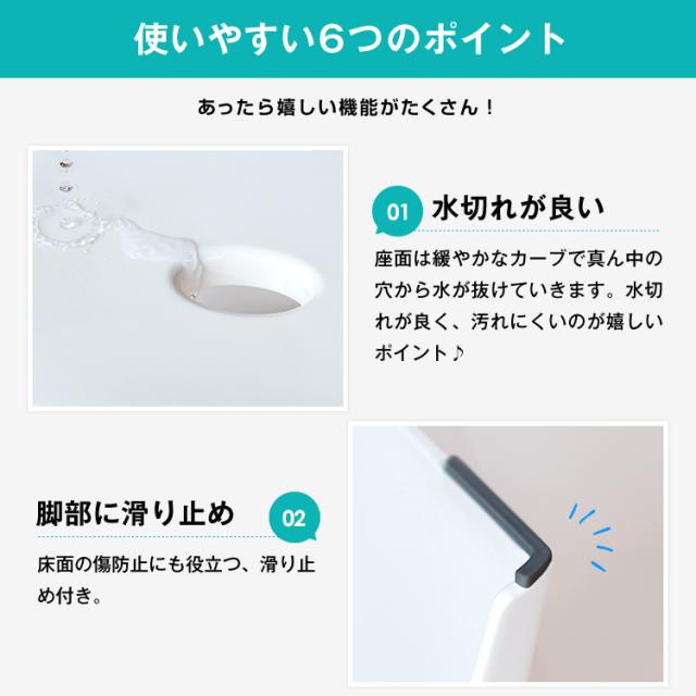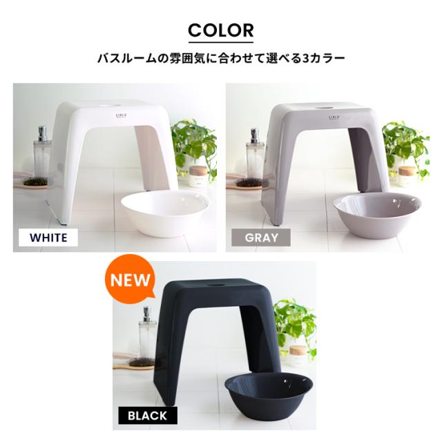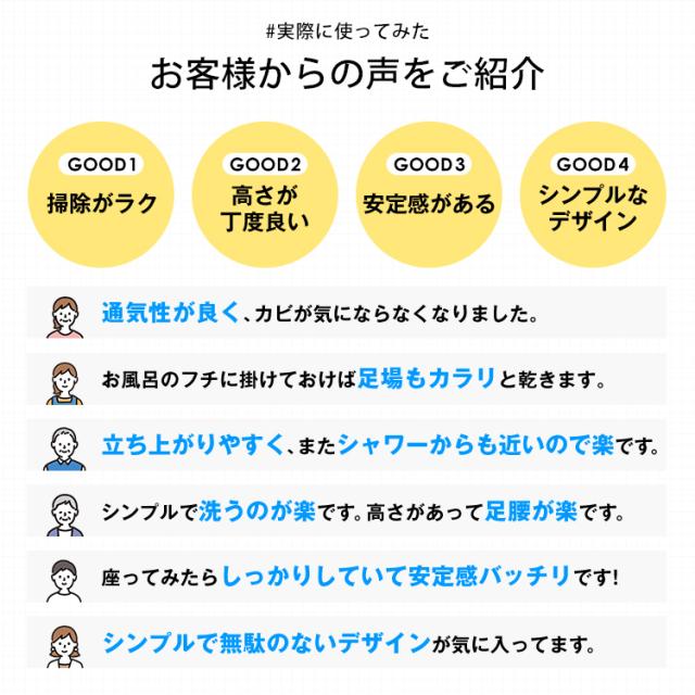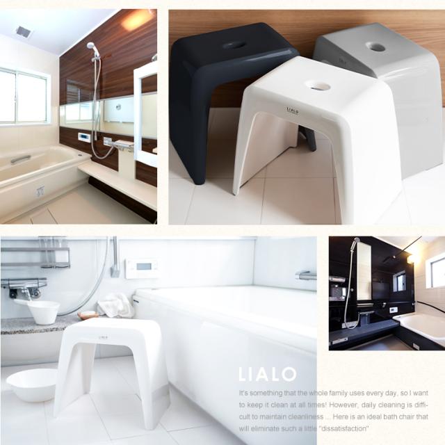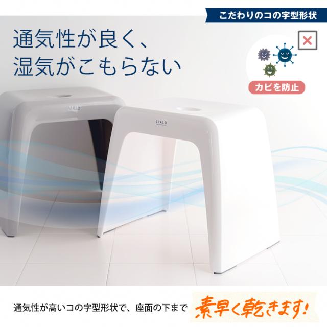 通気性が良く、乾きやすいコの字形状の風呂いす「リアロ」。無駄のない上品なフォルムで、洗練された浴室空間を演出します。浴槽にも引っ掛けられる形状で、乾きやすく、お風呂掃除もスムーズに。立ち座りが楽な、少し高めの35cmサイズです。