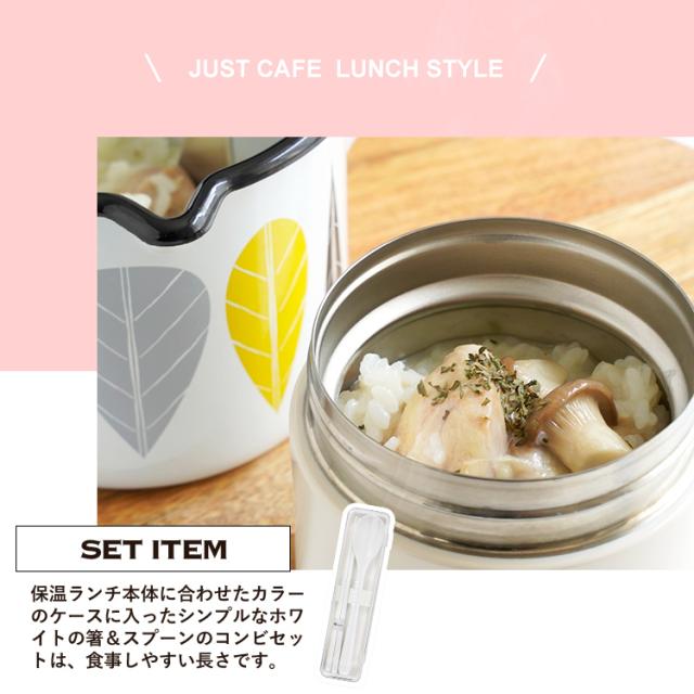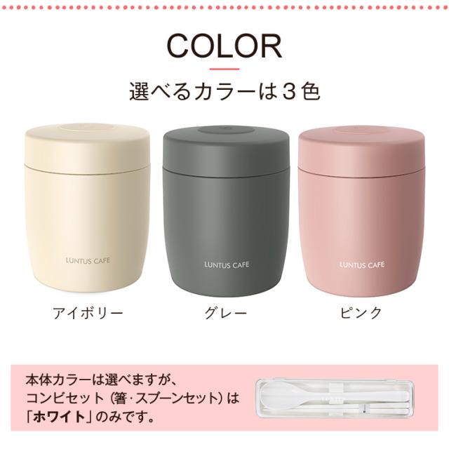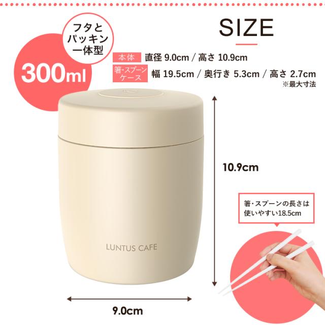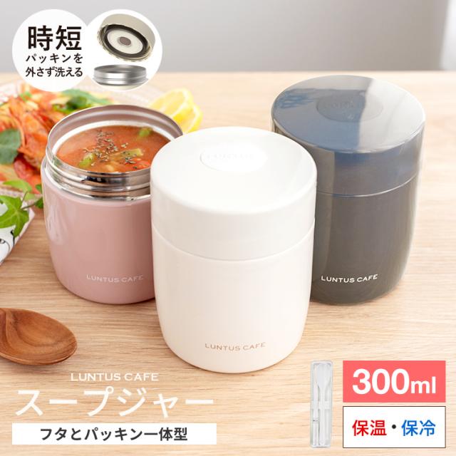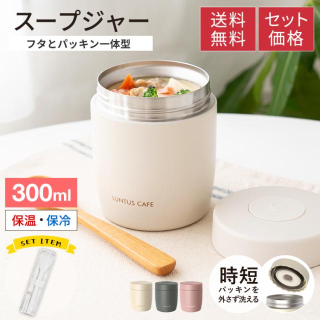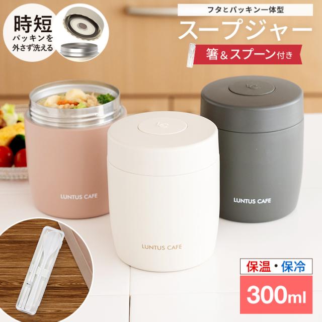 いつでも、どこでも、美味しく温かいスープが飲めるスープジャー。ステンレス真空断熱構造、保温・保冷で、中身の温度を保ちます。朝に熱々のスープを入れれば、お昼ごろには食べごろの温度に。夏の暑い時期なら、冷製スープにも使えます。パッキン一体型でお手入れ簡単♪付け忘れの心配もありません。コンビニサラダやサンドイッチと一緒に食べたい方など、しっかり食べられる普通サイズ300ml。箸スプーンのコンビセット付き。※こちらはスープジャー+コンビセットページです※<スープジャー>容量 : 300mlサイズ : 直径9.0×高さ10.9cm材質 : 本体=ステンレス鋼(アクリル樹脂塗装) フタ=PBT・ABS樹脂(中材:発泡PP断熱材) フタパッキン・エア弁=シリコンゴム<コンビセット>サイズ : 幅19.5×奥行5.3×高さ2.7cm材質 : 本体・スプーン=ABS樹脂、フタ・箸=AS樹脂、ホルダー=シリコーンゴム