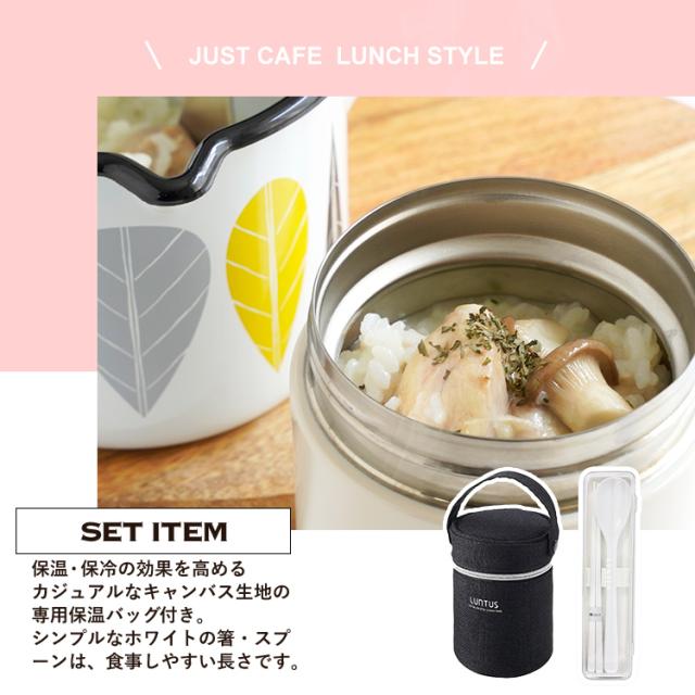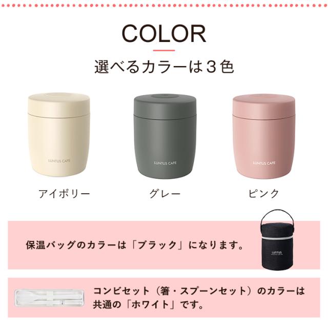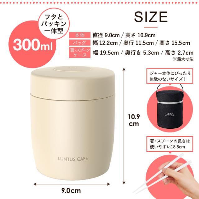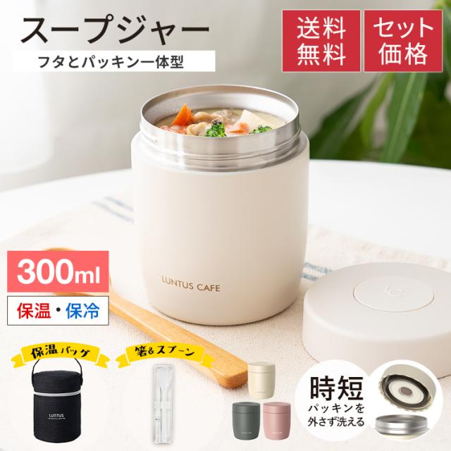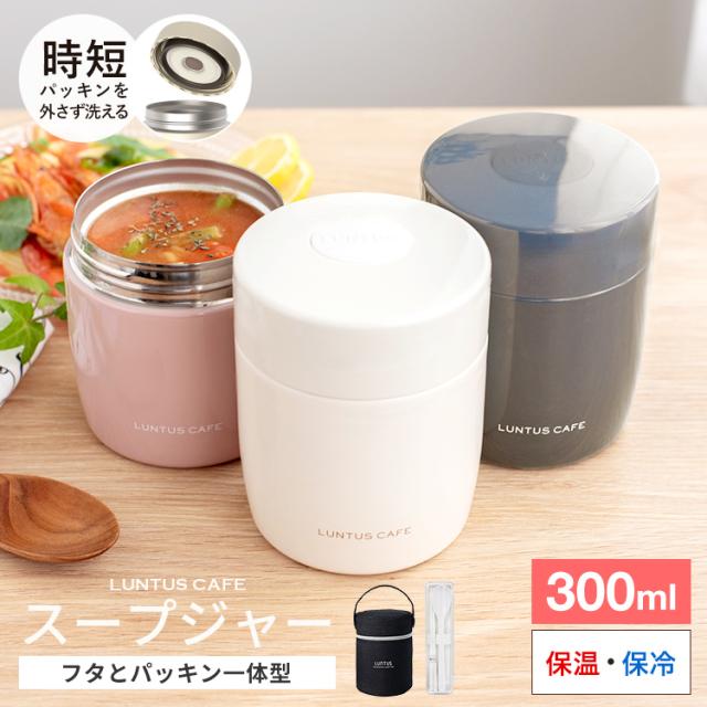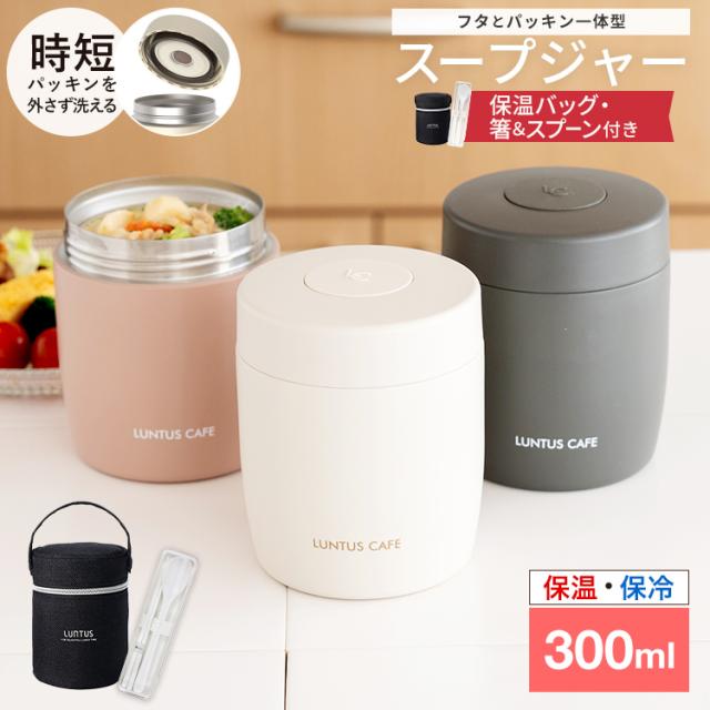 いつでも、どこでも、美味しく温かいスープが飲めるスープジャー。ステンレス真空断熱構造、保温・保冷で、中身の温度を保ちます。朝に熱々のスープを入れれば、お昼ごろには食べごろの温度に。夏の暑い時期なら、冷製スープにも使えます。パッキン一体型でお手入れ簡単♪付け忘れの心配もありません。コンビニサラダやサンドイッチと一緒に食べたい方など、しっかり食べられる普通サイズ300ml。お得な3点セットページです。※こちらはスープジャー+保温ポーチ+コンビセットページです※<スープジャー>容量 : 300mlサイズ : 直径9.0×高さ10.9cm材質 : 本体=ステンレス鋼(アクリル樹脂塗装) フタ=PBT・ABS樹脂(中材:発泡PP断熱材) フタパッキン・エア弁=シリコンゴム<保温ポーチ>サイズ : 幅12.2×奥行11.5×高さ15.5cm材質 : バッグ=ポリエステル/発泡PE/ナイロン/亜鉛合金<コンビセット>サイズ : 幅19.5×奥行5.3×高さ2.7cm材質 : 本体・スプーン=ABS樹脂、フタ・箸=AS樹脂、ホルダー=シリコーンゴム