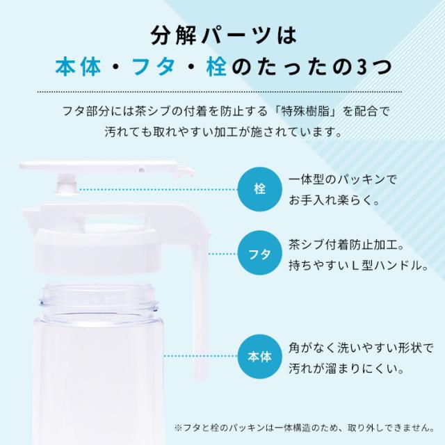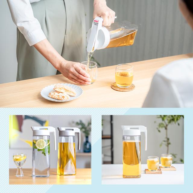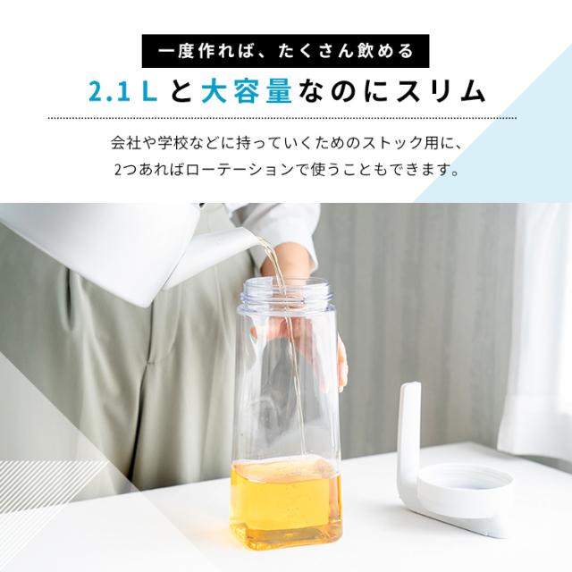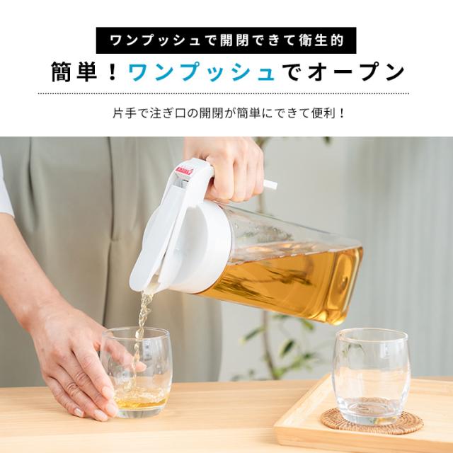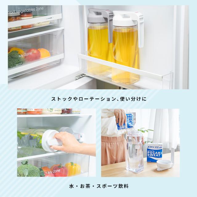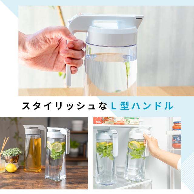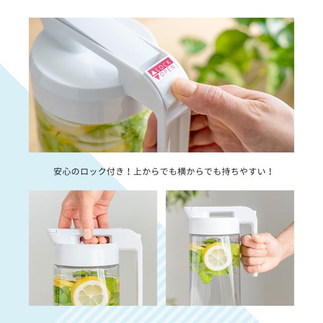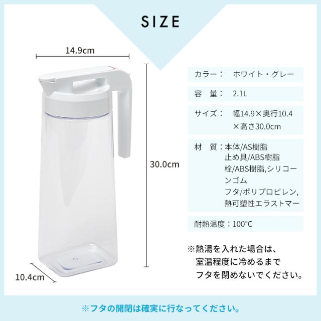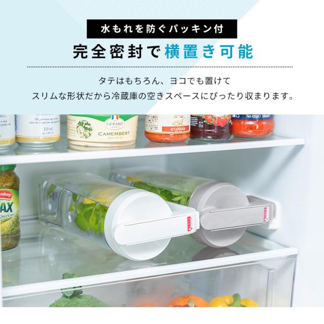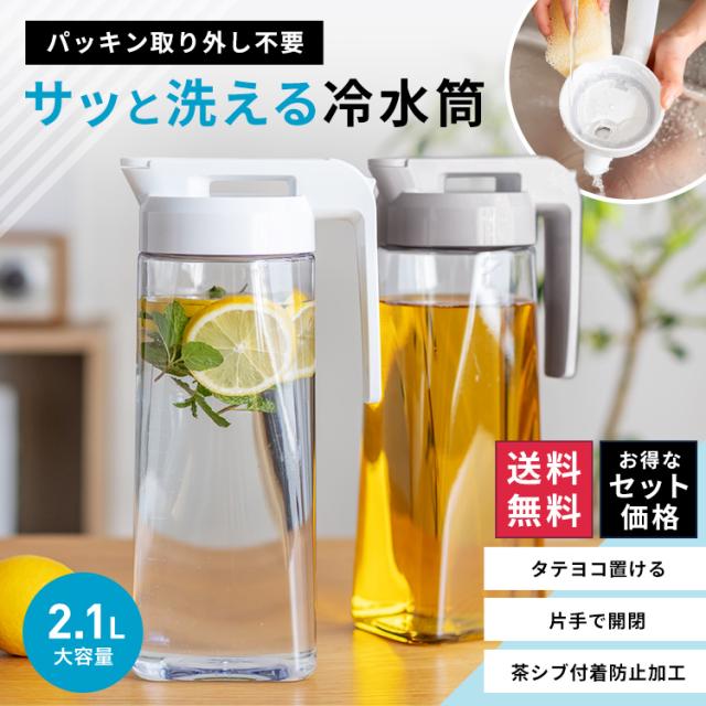 パッキン一体型だから、パッキンを取り外さなくても洗える冷水筒!面倒な洗い物も簡単に。完全密封で横置き可能な冷水筒「ドリンク・ビオ」2.1L【2本セット】!大容量なのにスリム設計。ドアポケットにもすっきり収納。上部持ち手付きなので、野菜室に入れても取り出しやすいです!嬉しい耐熱仕様で、麦茶などの煮出しも可能!中まで手を入れて洗えて清潔!片手ワンプッシュで注ぎ口の開閉ができるので、飲むときも衛生的♪お子さんがいる家庭などファミリーに2.0リットルサイズです。容量 : 2.0リットルサイズ : 幅14.9×奥行10.4×高さ30.0cm材質 : 本体=AS樹脂 栓=ABS樹脂/シリコーンゴム 止め具=ABS樹脂 フタ=ポリプロピレン/熱可塑性エラストマー