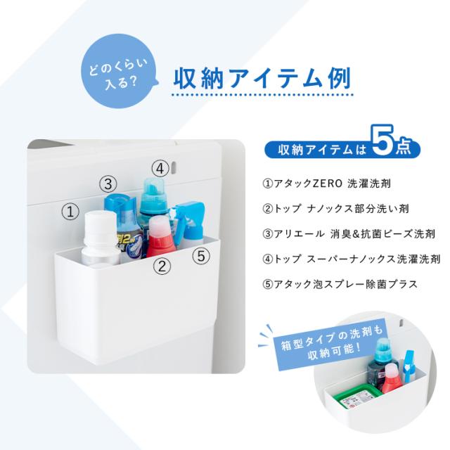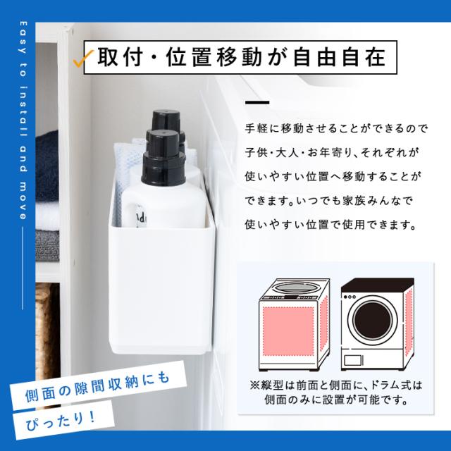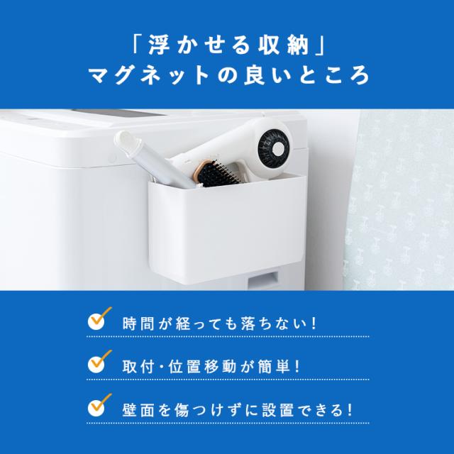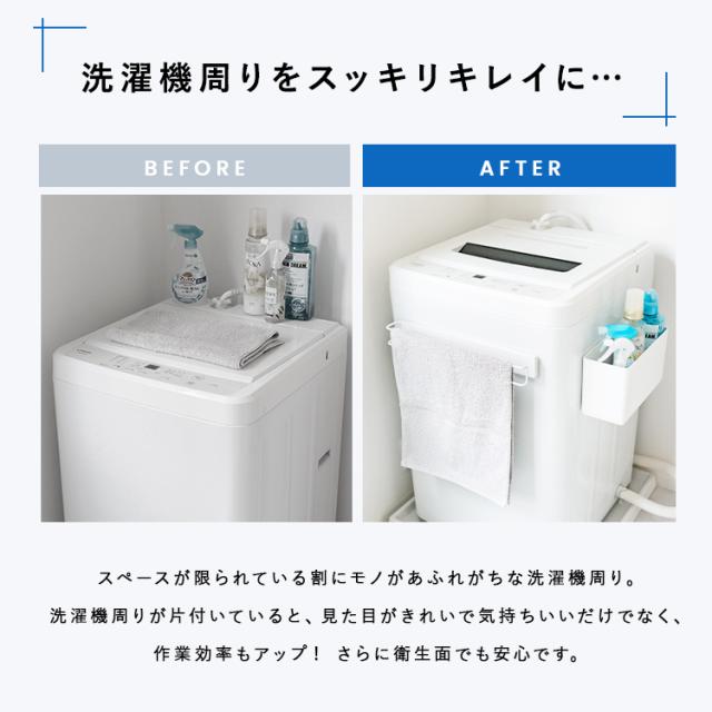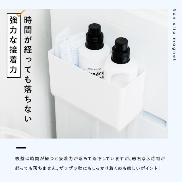 洗濯機廻りを有効活用。洗濯機にマグネットで取り付けるタイプの収納ラックです。しっかり入る大容量タイプで散らかりがちな洗面所周りの収納に最適!すべり止め付きで脱水の振動もへっちゃらです。