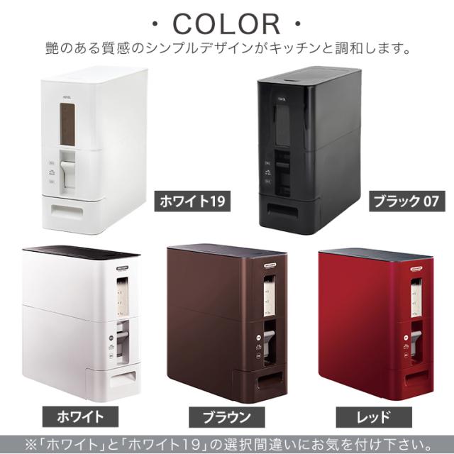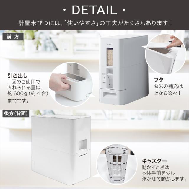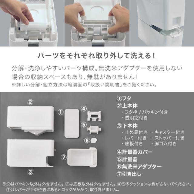 艶のあるボディがかもす高級感。レバーを下げて簡単に計量(0.5合)できます。無洗米にも対応。各パーツは簡単に取り外しできるので、洗えて清潔。残量が見える小窓と目盛り付き。ちょっとした移動にも適したキャスターも付属。キッチンに置きたくなる、シンプルスタイリッシュデザイン。一人暮らし、夫婦2人世帯に最適な6kgサイズです。お米の容量 : 6kgサイズ : 幅15.1×奥行34.2×高さ35.3cm材質 : 上本体・下本体・止め具・キャスター・計量器カバー・引出し=PP フタ・フタ枠・底板・計量器・レバー・ストッパー・無洗米アダプター=PS 透明窓=AS樹脂 パッキン=シリコーンゴム クッション=発砲PE 脚ゴム=PE