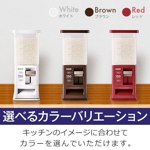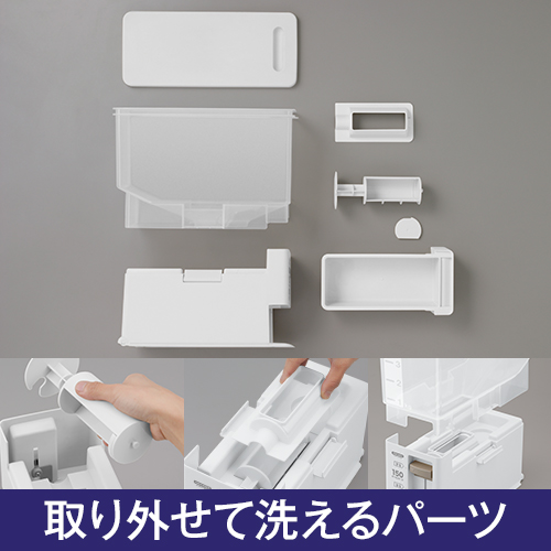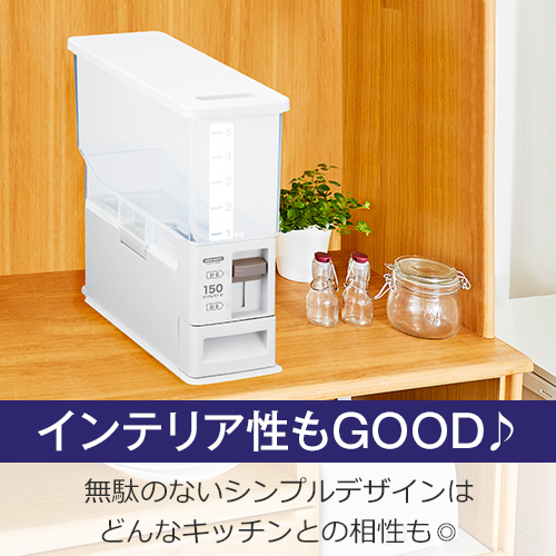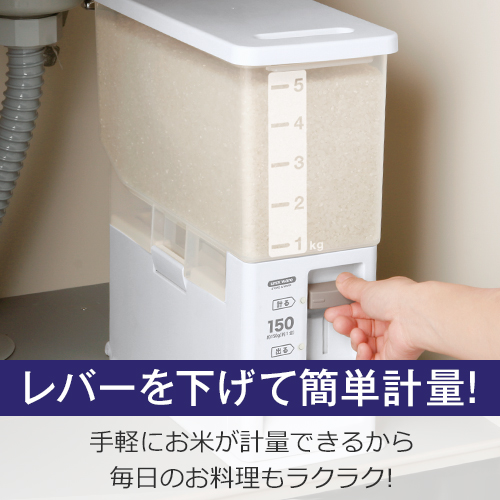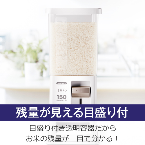 レバーを下げて簡単に計量(1合)できます。無洗米にも対応。各パーツは簡単に取り外しできるので、洗えて清潔。目盛り付きの透明容器で残量が分かりやすい。ちょっとした移動にも適したキャスターも付属。キッチンに置きたくなる、シンプルスタイリッシュデザイン。一人暮らし、夫婦2人世帯に最適な6kgサイズです。お米の容量 : 6kgサイズ : 幅15.0×奥行35.0×高さ36.0cm材質 : 上本体・下本体・フタ・止め具・引出し・キャスター=ポリプロピレン 計量器・レバー・無洗米アダプター=ABS樹脂 ネジ=ステンレス鋼 計量器カバー=ポリプロピレン/発泡ポリエチレン