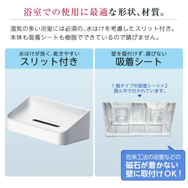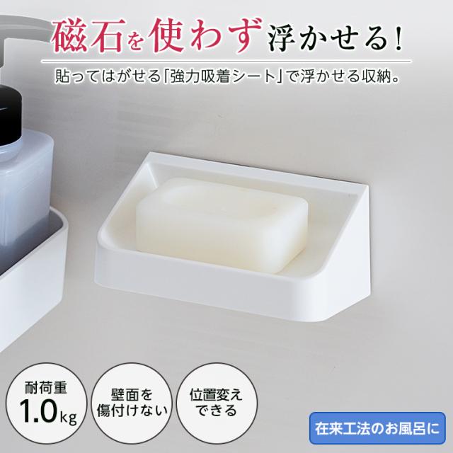 何度でも取付取り外しできる吸着タイプのシートを使用しております。お風呂はもちろん洗面所などでも活躍する便利アイテムです。取り付け方法:吸着シート耐荷重:1.0kgサイズ:幅14.1×奥行8.8×高さ6.7cm材質:本体=ABS樹脂 吸着シート=PC