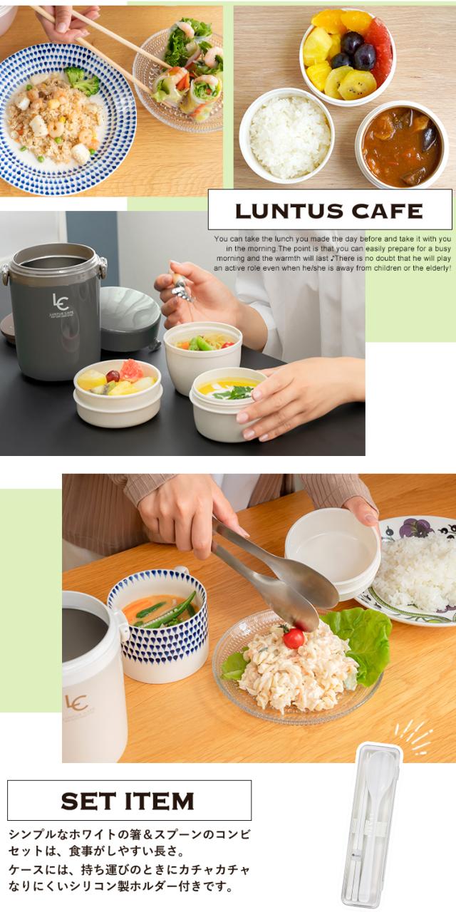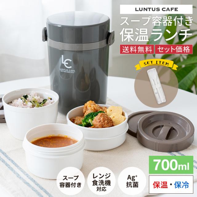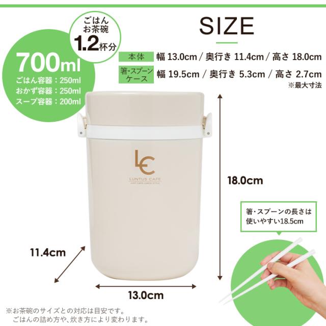 いつでもどこでも温かご飯が美味しく食べられる保温ランチ。ステンレス真空断熱構造で、保温・保冷で、中身の温度を保ちます。スープ容器も付いているので、お味噌汁やスープ、カレーや丼、パスタなど汁気が多いメニューも持ち運べます。食洗器にも対応、忙しい家事の短縮にも。レンジで、温め直しもできます。しっかり食べられる普通サイズ700mlです。箸スプーンのコンビセット付き。保温弁当箱 B700容量 : 700ml ( ごはん 250ml おかず 250m スープ容器 200ml )サイズ : 幅13.0×奥行11.4×高さ18.0cm材質 : 保温ケース=ステンレス鋼(アクリル樹脂塗装) ご飯容器フタ=ポリプロピレン(中材:発泡PP断熱材) 保温ケースフタ・リング・止め具・ご飯容器本体・おかず容器本体・スープ容器本体・スープ容器フタ・弁本体=ポリプロピレン おかず容器フタ・スープ容器フタパッキン・エア弁=シリコーンゴムコンビセットサイズ : 幅19.5×奥行5.3×高さ2.7cm材質 : 本体・スプーン=ABS樹脂、フタ・箸=AS樹脂、ホルダー=シリコーンゴム