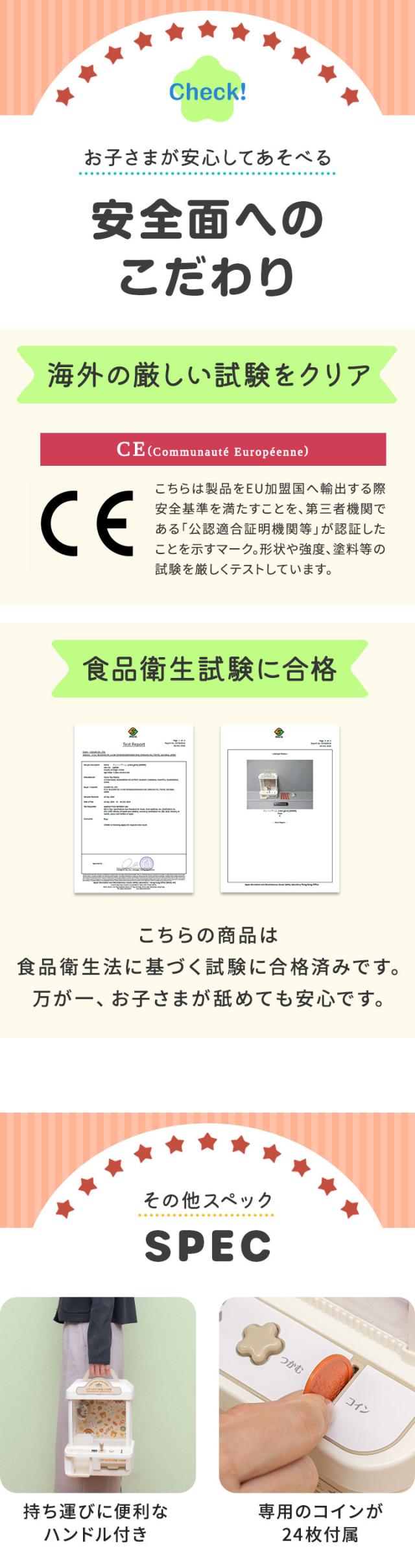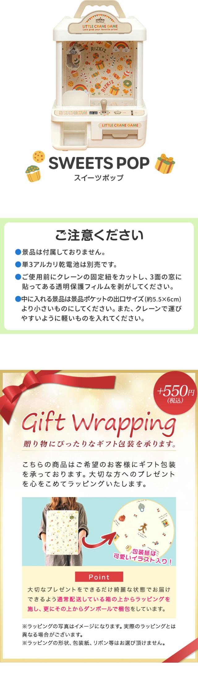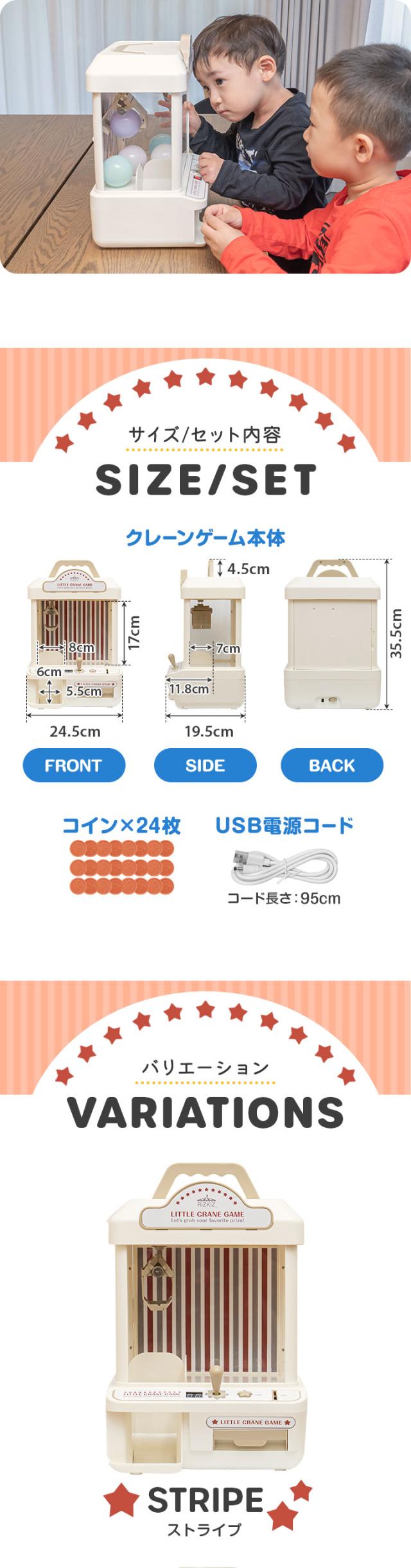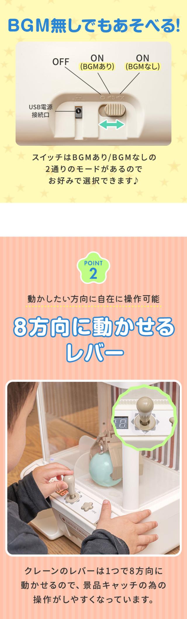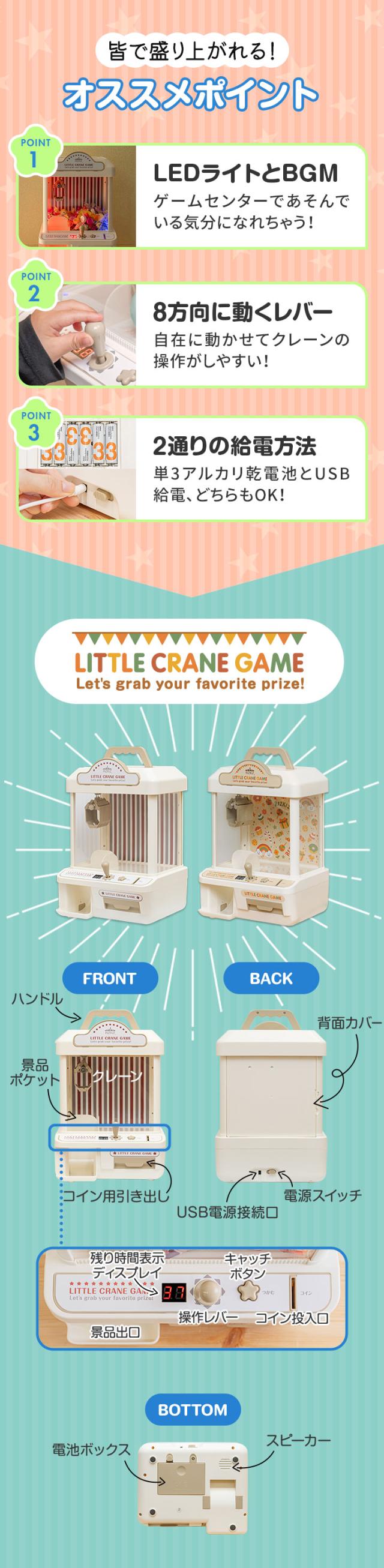 | 特記事項: ・景品は付属しておりません。 ・単3アルカリ乾電池は別売です。 ・USB給電は電源供給用であり、充電機能(内蔵バッテリー)はございません。コードレスでの使用はできませんのでご了承ください。 ・ご使用前にクレーンの固定紐をカットし、3面の窓に貼ってある透明保護フィルムを剥がしてください。 ・中に入れる景品は景品ポケットの出口サイズ(約5.5×6cm)より小さいものにしてください。また、クレーンで運びやすいように 軽いものを入れてください。 |