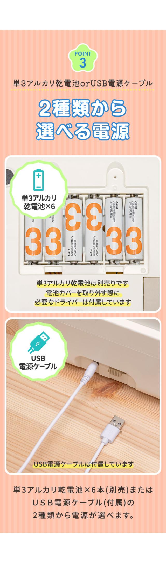 | 給電方式: 単三アルカリ乾電池×6本(別売) / USB給電(USB電源コード付属) ※電池カバーを開ける為のドライバーは付属しています |