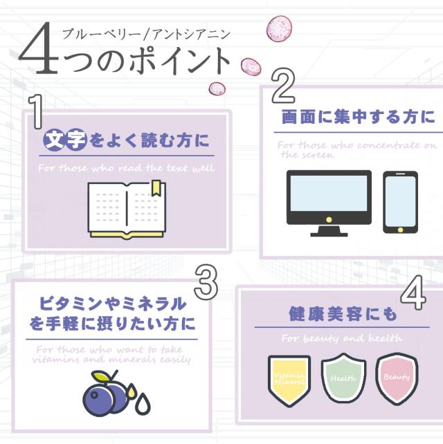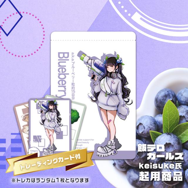 | SNSで話題の人気イラストレーター、keisuke氏(@ksk_illust)を起用した新しいかたちのサプリメントプロジェクト。 サプリメント1袋につき1枚、ここでしか手に入らないさぷりっ娘イラストカードが付属します。 楽しくカードを集めながら、サプリで健康習慣を! ハッキリ!スッキリ生活をサポート! ブルーベリーの成分で一番有名なものがポリフェノールの一種である「アントシアニン」です。 アントシアニンは、植物が自分の身を守るために蓄える青紫色の天然色素です。 その他、食物繊維やビタミンC、ビタミンEなどのビタミン、亜鉛などのミネラルも豊富に含まれると言われています。 | |