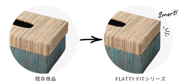 FLATTY FITシリーズは、4つのサイズ展開でお好みのサイズにぴったり合ったティッシュケースをお選びいただけるだけでなく、既存のティッシュケースの蓋の形状を改良し、よりすっきりとフィットするデザインに仕上げたことで、スマートで洗練された印象を演出します。