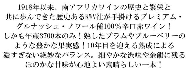 1918年以来、南アフリカワインの歴史と繁栄と 共に歩んできた歴史あるKWV社が手掛けるプレミアム・ グルナッシュ・ノワール種100%辛口赤ワイン! しかも年産3700本のみ!熟したプラムやブルーベリーの ような豊かな果実感!10年目を迎える熟成による 濃すぎない絶妙なバランス。細やかな渋味や余韻に残る ほのかな甘味が心地よい素晴らしい一本!