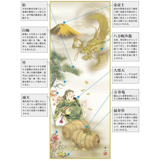 厄災を追い払うといわれる龍神、「歳寒の三友」と称えられる松・竹・梅、「難を転じて福となす」に通じる南天と福寿草、健康長寿の代名詞である万寿亀。吉祥慶賀の題材ばかりを巧みに描き上げた、いかにも金運を招き入れてくれそうな開運作品です。