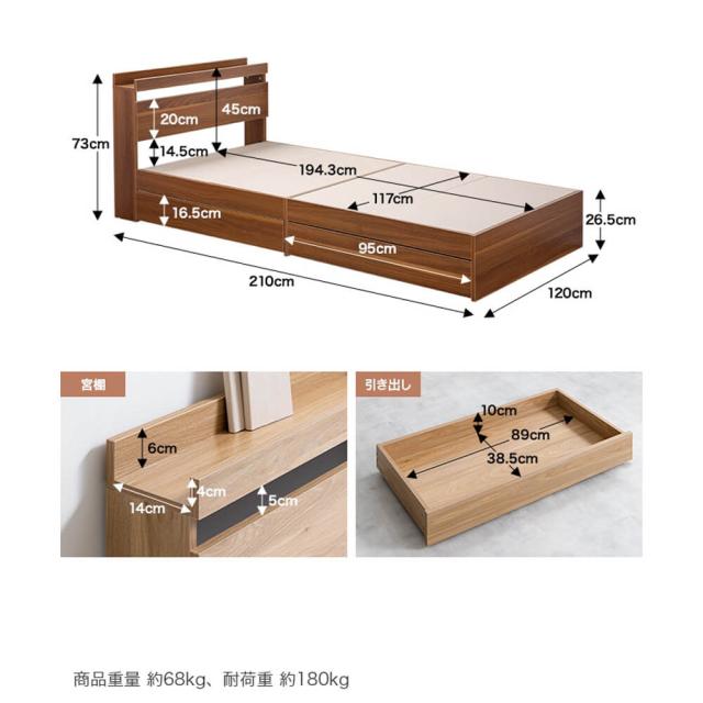 ヘッドボード内寸は幅120cm×奥行14cm×高さ6cm、引き出し内寸は幅89cm×奥行38.5cm×高さ10cmとなっており、これらのスペースを利用して衣類や寝具、書類などを整理整頓。