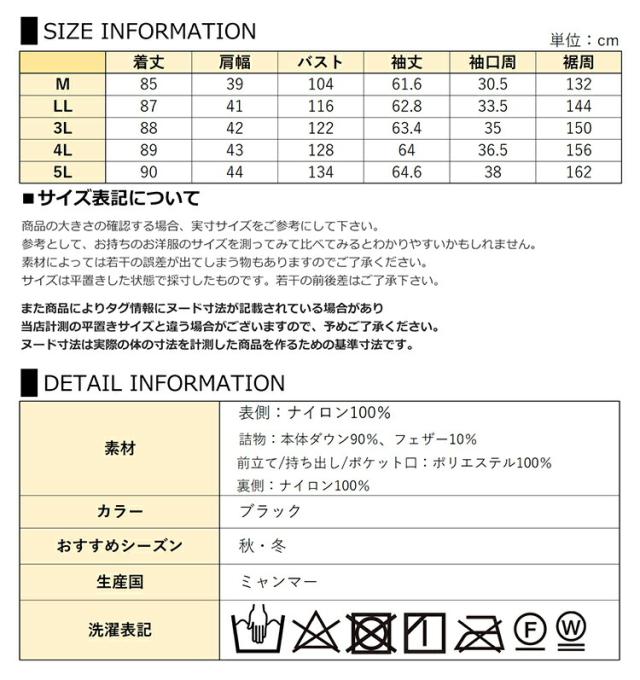 | 素材 | 表側:ナイロン100% 詰物:本体 ダウン90%、フェザー10% 前立て/持ち出し/ポケット口:ポリエステル100% 裏側:ナイロン100% |