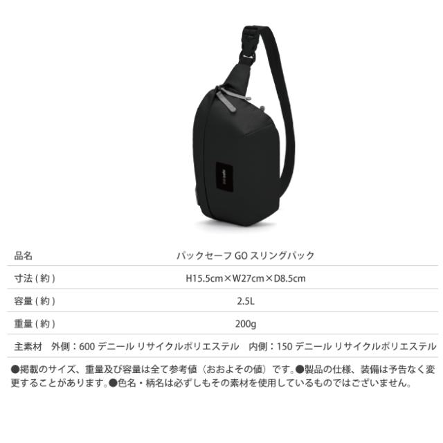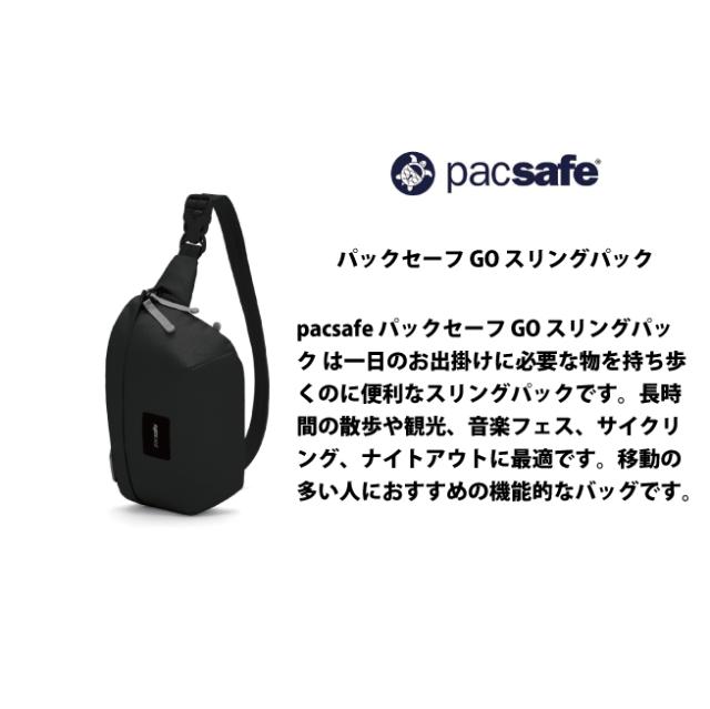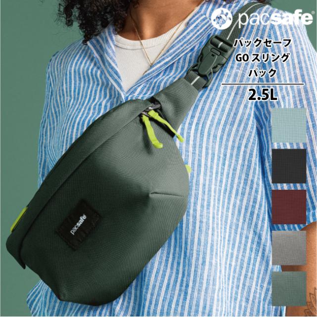 pacsafe パックセーフ GO スリングパック は一日のお出掛けに必要な物を持ち歩くのに便利なスリングパックです。長時間の散歩や観光、音楽フェス、サイクリング、ナイトアウトに最適です。移動の多い人におすすめの機能的なバッグです。