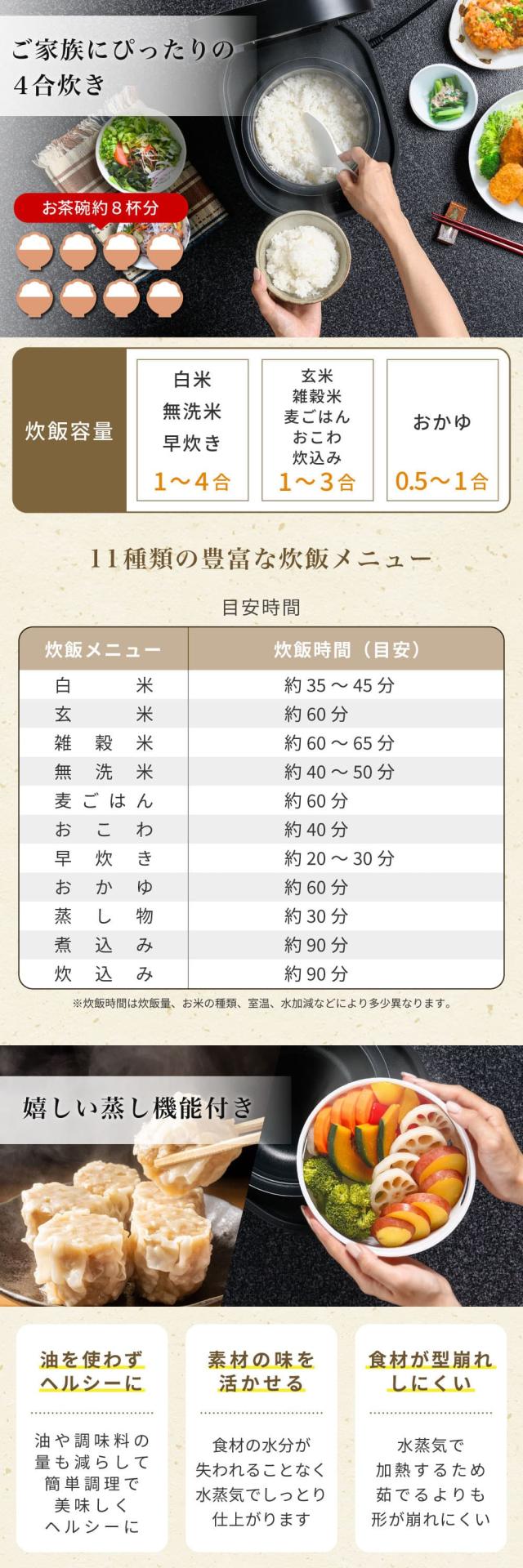 * 炊飯メニュー:白米、玄米、雑穀米、無洗米、麦ごはん、おこわ、おかゆ、蒸し物、煮込み、炊込み、早炊き、保温