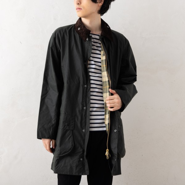 Barbour(バブアー)のコートが入荷しました☆なめらかで控えめな光沢感が特徴のワックスジャケット。異素材の襟ぐりや、大きめのフロントポケットなど細部までディテールにこだわりました。やや長めの着丈で、カジュアルにはもちろん、トラッドスタイルやスーツに合わせてもおしゃれに決まります。