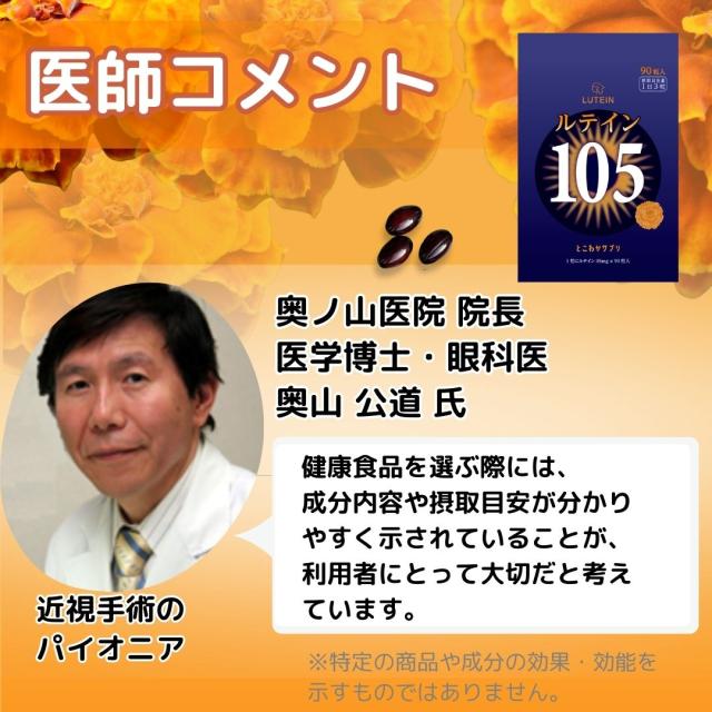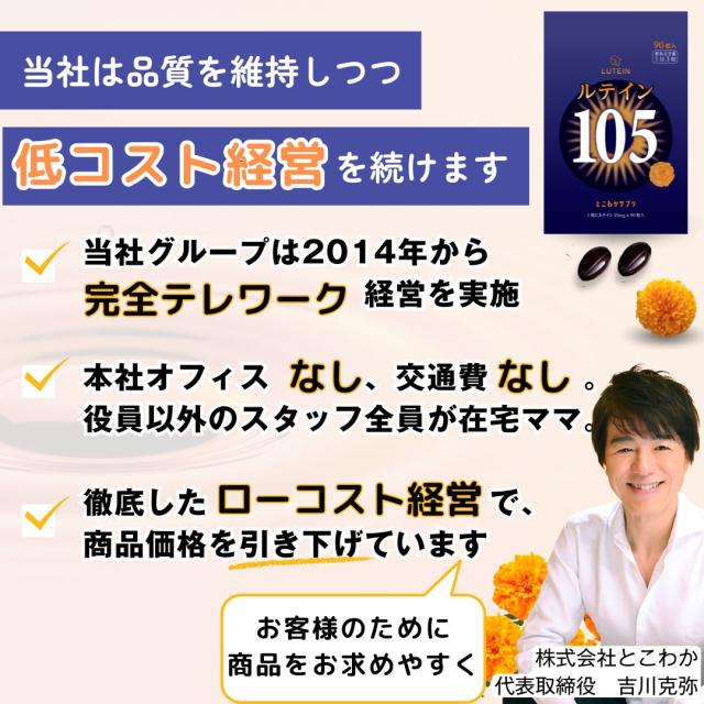 とこわかサプリ「ルテイン105?」は、毎日105?(3粒の場合)の大容量ルテインを摂取できます。1日2粒なら70?(45日分)、1粒なら35?(120日分)を摂取できます。