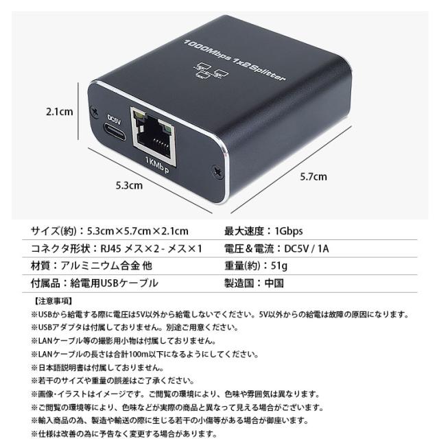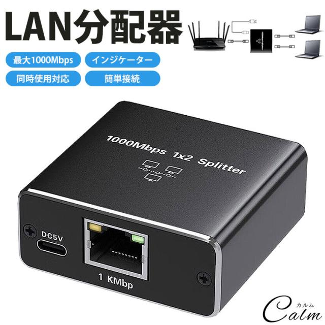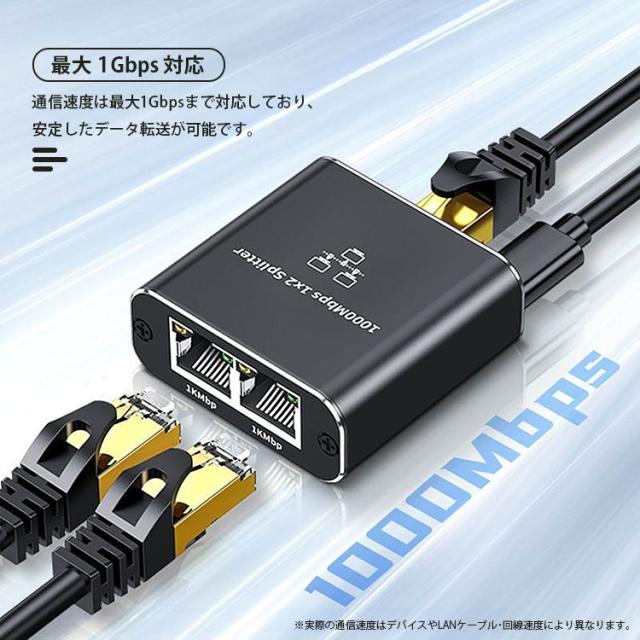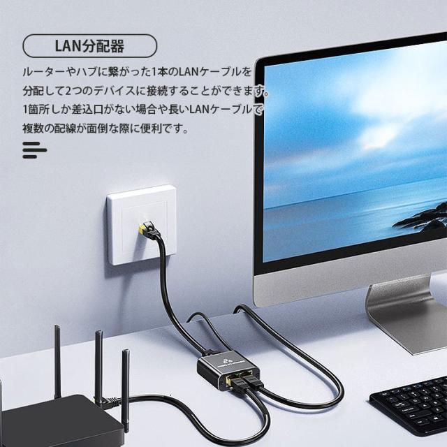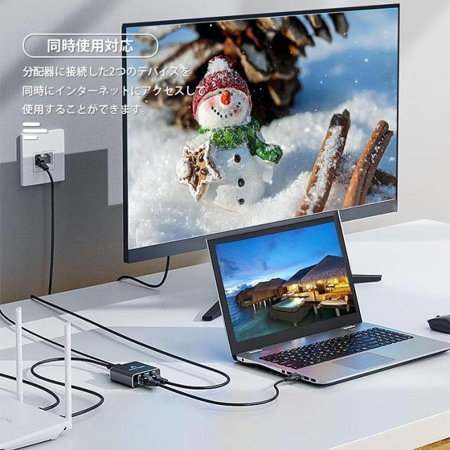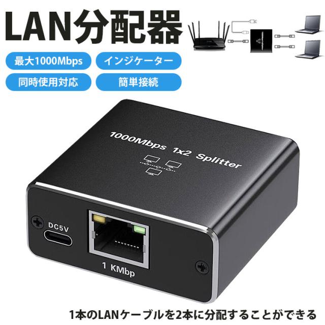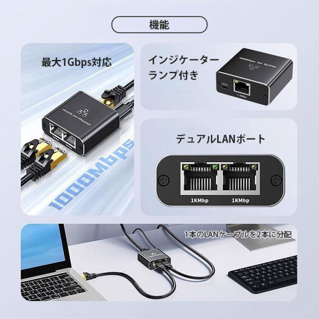 LAN 分配器 スプリッタ RJ45 2台同時使用可能 2ポート ネットワーク LANケーブル 有線LAN 1Gbps対応 ギガビット 簡単接続 インジケーターランプ USB給電 小型