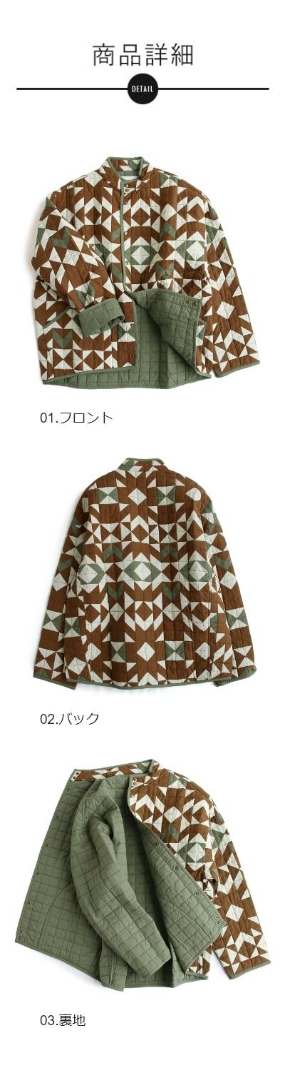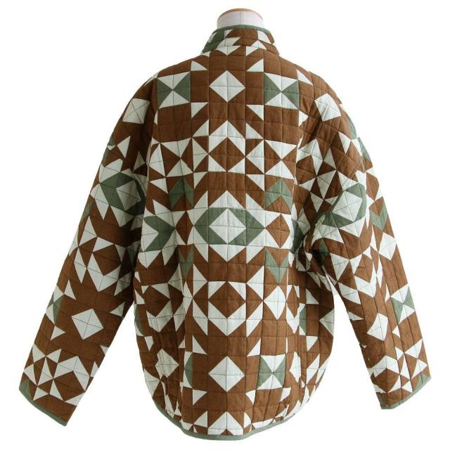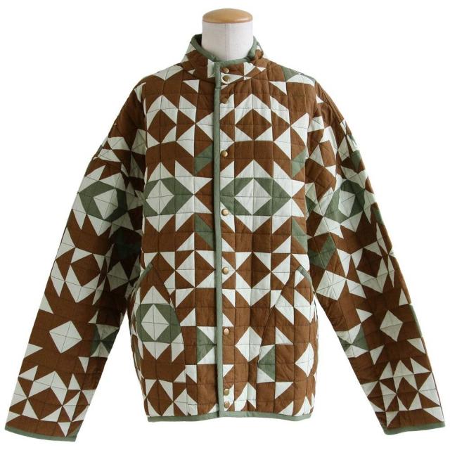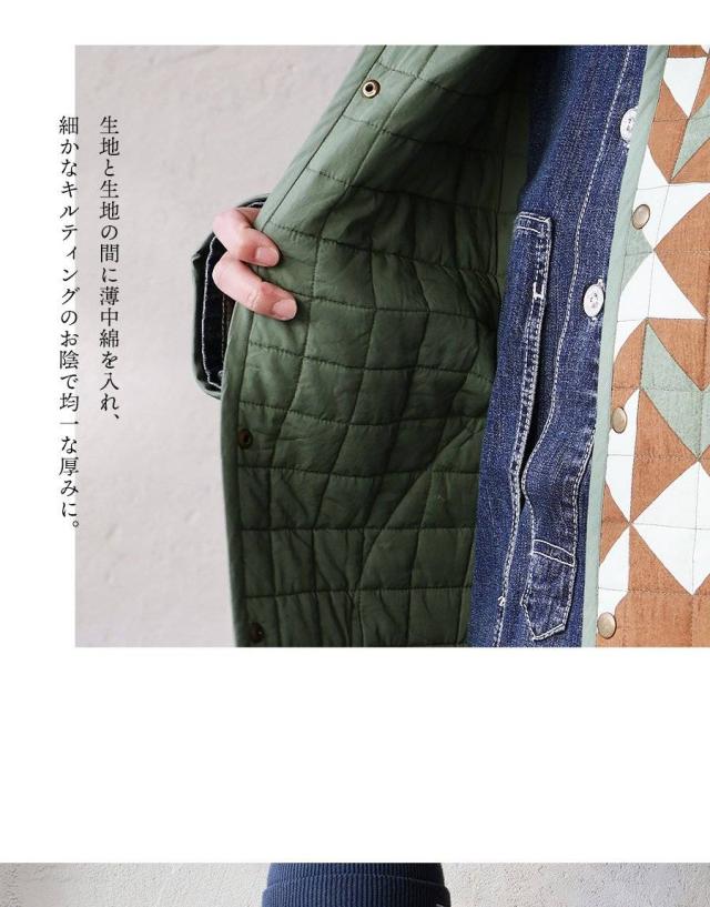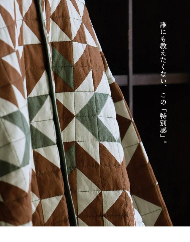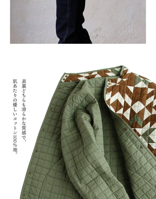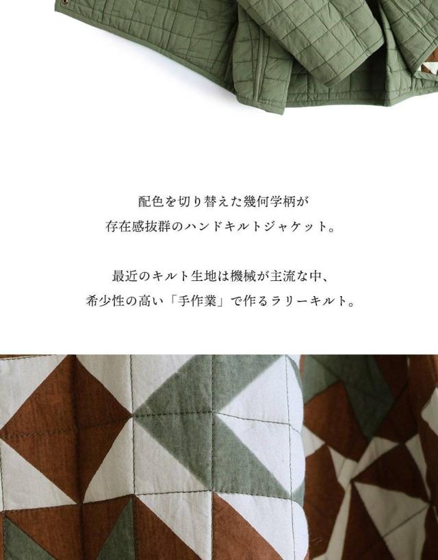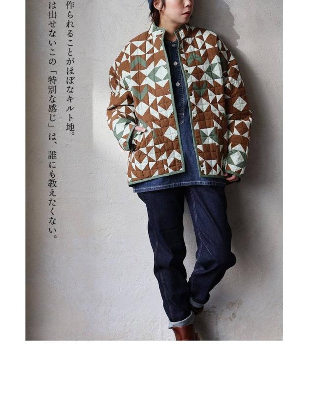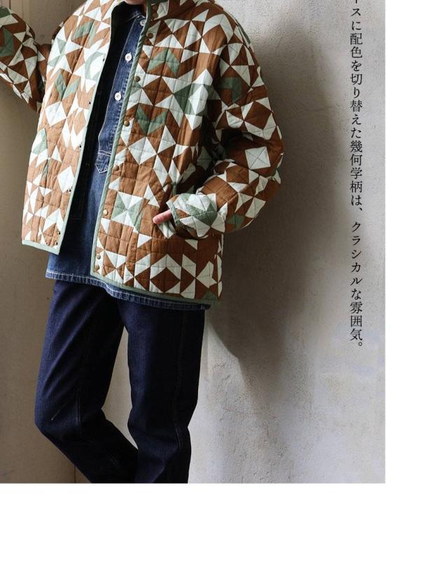 ・配色を切り替えた幾何学柄が存在感抜群のハンドキルトジャケット。