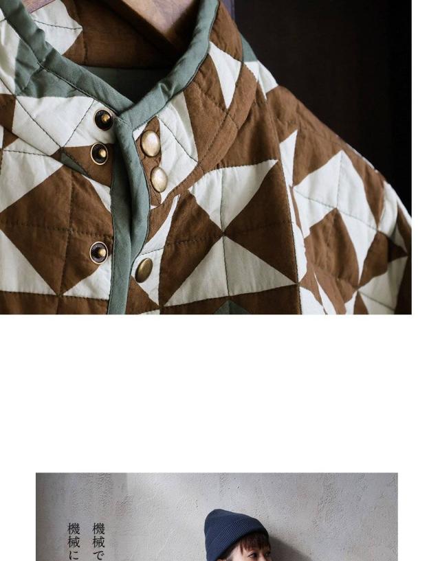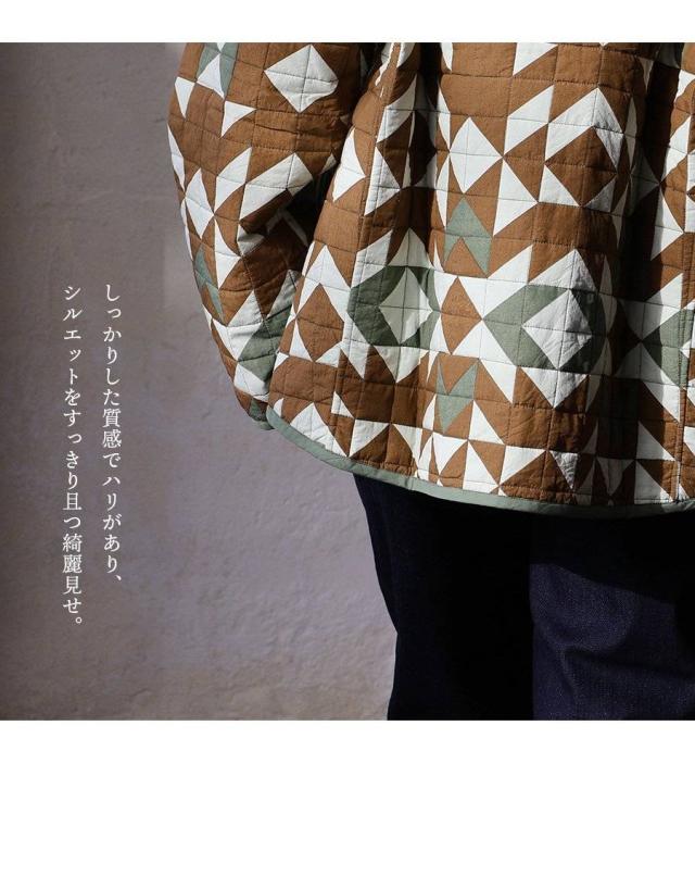 ジャケット キルトジャケット レディース 幾何学柄 配色 手作業 綿100 コットン 薄中綿 暖かい 軽い すっきり 大きいサイズ 体型カバー カジュアル ミリタリー 秋 冬 パティ