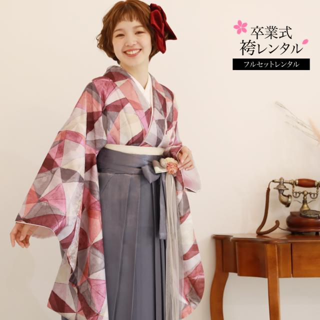 卒業式 袴 レンタル 女 大学 フルセット 袴セット 女性 卒業式袴セット 袴フルセット 「ピンクとオレンジ三角幾何学」レンタル シンプル 大人 ピンク系 オレンジ系 パープル系 グレー系