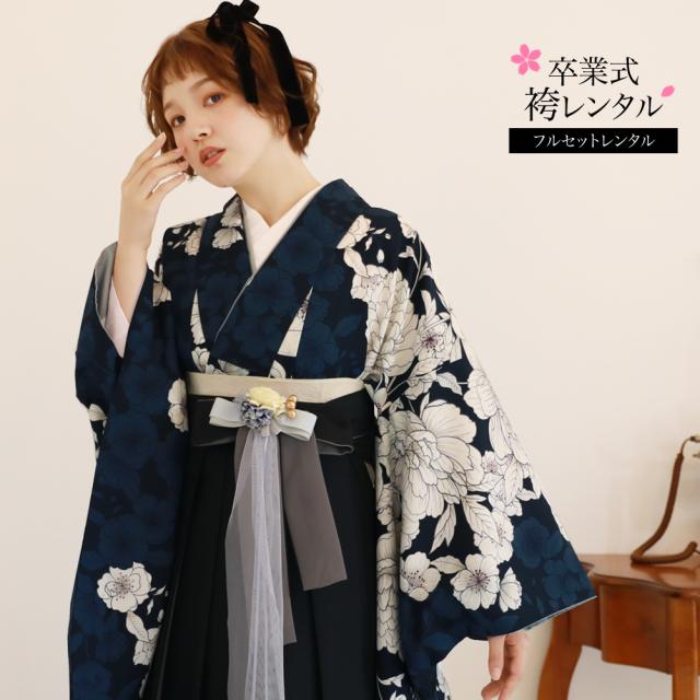 【履物が選べるレンタル】 卒業式 袴 レンタル 女 大学 フルセット 袴セット 女性 卒業式袴セット 袴フルセット 「濃紺地に白牡丹と花々」紺色 ネイビー レンタル シンプル 大人