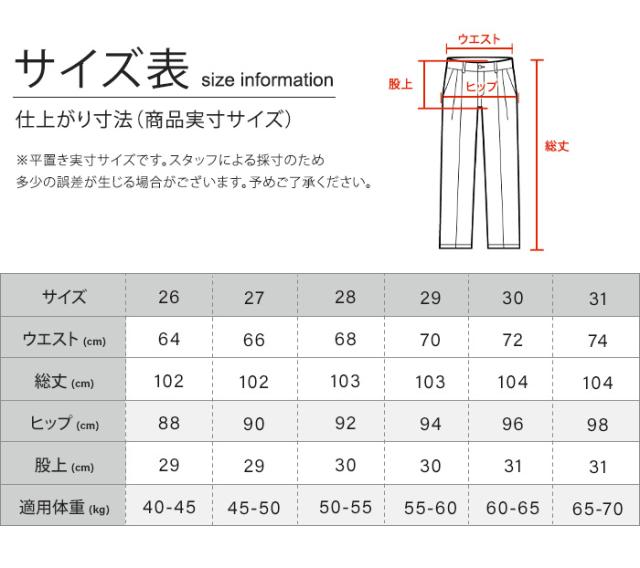 26=ウエスト66、総丈102、ヒップ87、股上29、適用体重40-45kg 27=ウエスト70、総丈103、ヒップ92、股上30、適用体重45-50kg 28=ウエスト74、総丈104、ヒップ98、股上30、適用体重50-55kg 29=ウエスト78、総丈105、ヒップ102、股上30、適用体重55-60kg 30=ウエスト82、総丈106、ヒップ106、股上31、適用体重60-65kg 31=ウエスト86、総丈106、ヒップ110、股上31、適用体重65-70kg ※こちらのサイズは平置き実寸サイズです。同じ商品であっても素材、測る位置により1〜3cm程度誤差が生じる場合がございます。 |