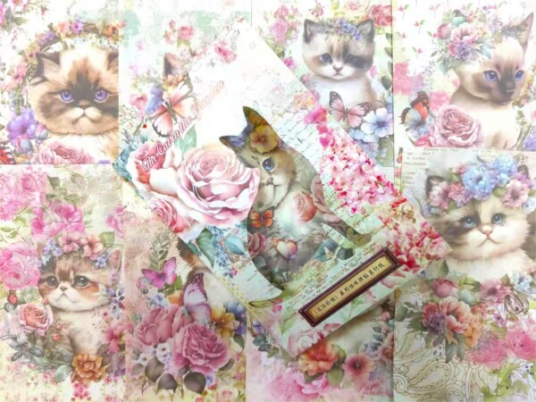 【6種類の猫モチーフ素材紙】ひまわりの花猫、バラと猫、猫と紫蝶、オレンジ色の猫、ブラックリア、窓台の花猫など、猫モチーフのデザインが豊富で、応用にも最適です。