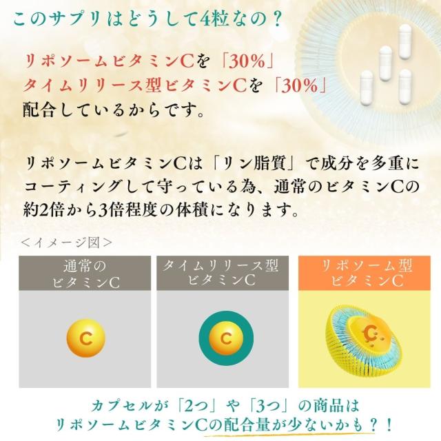 【リポソームはリン脂質でコーティングされているので、「体積(かさ)」が大きくなります】つまり、「1日4粒」はリポソームが本当にたっぷり入っているという証明です。