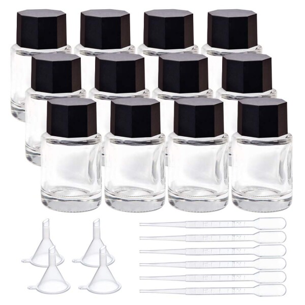 BENECREAT ガラスインクボトル 15ml 12個セット インクボトル 空ガラスボトル 黒ABSプラスティック蓋付 注ぎツール付 万年筆 書道 進学 液体保存容器