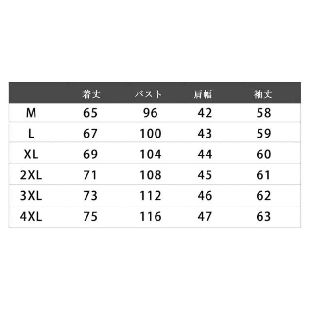 | サイズについての説明 | M L XL 2XL 3XL 4XL サイズ:写真通り ※上記サイズは平置き実寸になります。サイズ表の実寸法は商品によって1-3cm程度の誤差がある場合がございます。 |