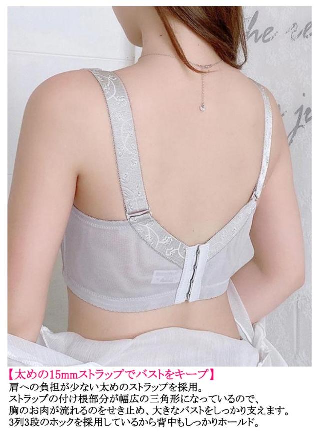 | 2枚セット 【バストの膨らみ、立体感を抑えた独自のカップ】より胸を小さく見せるようカップの膨らみは極限まで抑えつつ、自然で美しいバストラインを実現。胸を押し潰すだけじゃない独自設計だから、ストレスフリー。 【伸縮性のあるレースではみ出る胸をしっかりホールド】フロント上部に伸縮性のあるゴムを入れ、視線が気になる谷間部分も高級感のあるラッセルストレッチレースでしっかりガード。さらに小胸に見えるよう設計しました。バスト全体をレースで覆っているので苦しくなりません。 【脇高設計!Wのボーンで流れるお肉をしっかりキャッチ】脇高のWボーンでお肉が脇に流れるのを防ぎ、気になるはみ肉の凸凹もスッキリ綺麗に。より脇のほうまでワイヤーを伸ばすことで、脇肉を集めてシルエットをスッキリさせます。 【太めの15mmストラップでバストをキープ】肩への負担が少ない太めのストラップを採用。ストラップの付け根部分が幅広の三角形になっているので、胸のお肉が流れるのをせき止め、大きなバストをしっかり支えます。3列3段のホックを採用しているから背中もしっかりホールド。 【カップとレースはあえて縫い付けない 汗がたまりにくいので着心地◎】カップとレースが分離しているので、胸同士がくっついてしまうことを最低限に抑え、胸元に汗がたまりにくい。カップがバストの形に添いやすく、綺麗にフィットします。カップ裏は、肌にやさしい綿100%素材だから着心地抜群。 | |