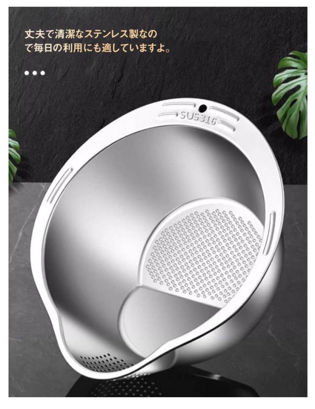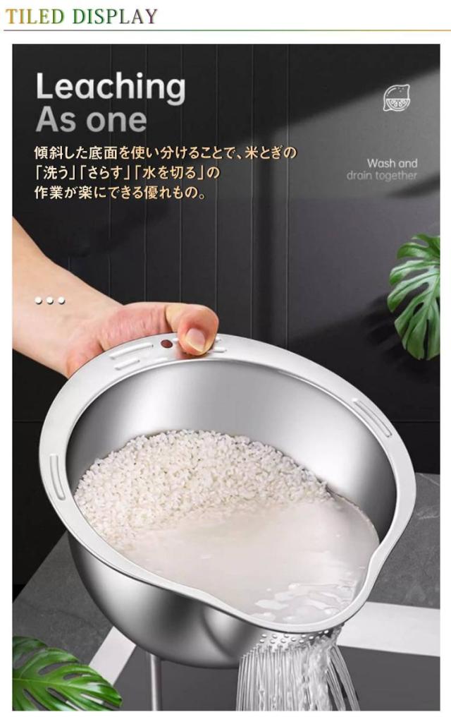 | ・ボウルとザルがひとつに3WAY対応の万能ボウル ・傾斜した底面を使い分けることで、米とぎの「洗う」「さらす」「水を切る」の作業が楽にできる優れもの。 ・ボウルの側面の一部に細かな穴がついており、ボウルを傾けることで簡単に水切りができます。 ・丈夫で清潔なステンレス製なので毎日の利用にも適していますよ。 | |