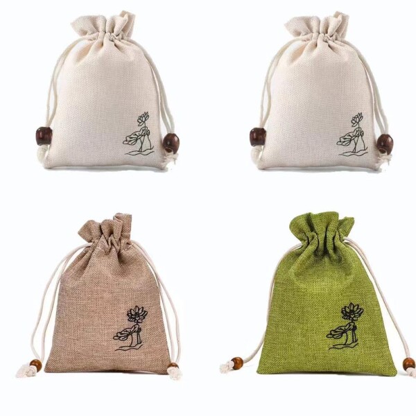 巾着袋 収納袋 小物入れ 無地 帆布 引きひも袋 かわいい おしゃれ (地色+地色+緑+亜麻, 12*15)