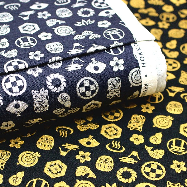 鳥居や達磨、鯛や扇子と色んな和柄がラメでプリントされた豪華なドビー生地。