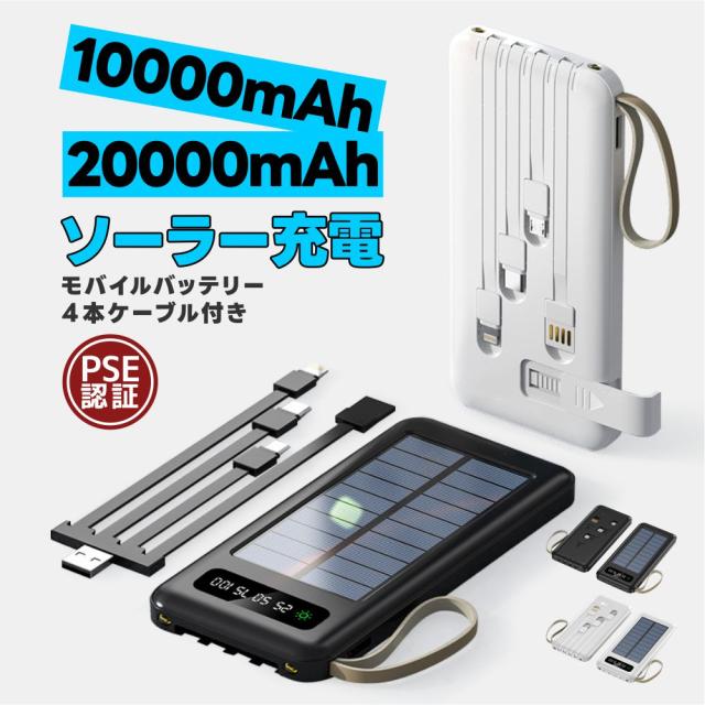 ソーラー モバイルバッテリー 大容量 モバイルバッテリー 10000mAh 20000mAh iPhone16 15 急速充電 ソーラーチャージャー 4台同時充電 蓄電 IPX7防水 高輝度 LEDライト付き 停電対策 地震 災害 防災グッズ 懐中電灯 便利グッズ 旅行 出張 4in1ケーブル 非常用 緊急用 軽量