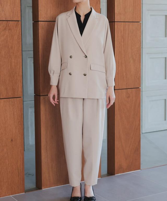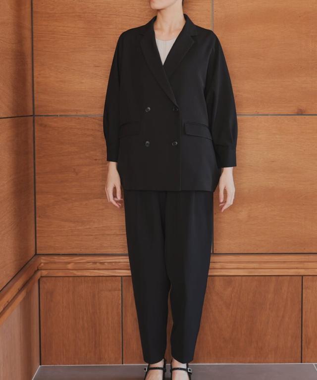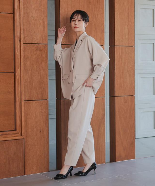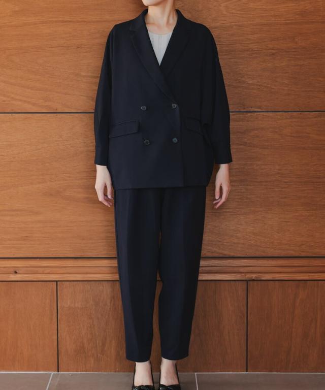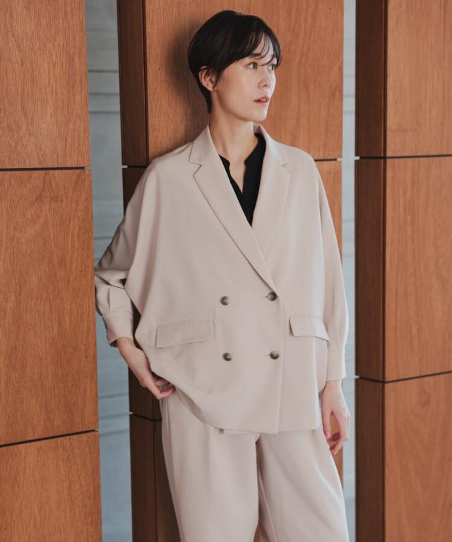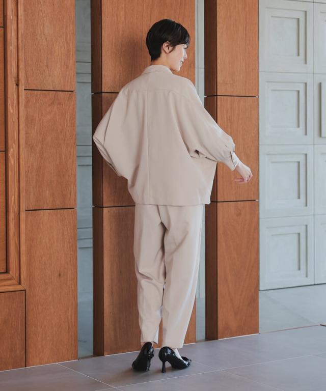 ドルマンスリーブが特徴的なジャケットとパンツの2ピーススーツ。
