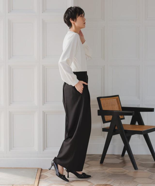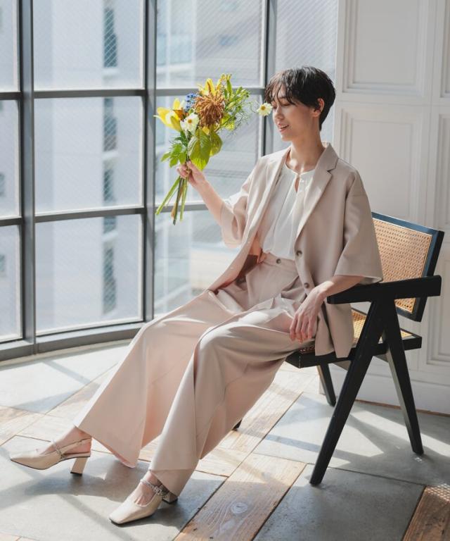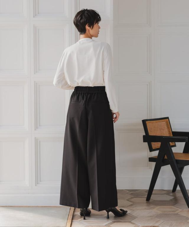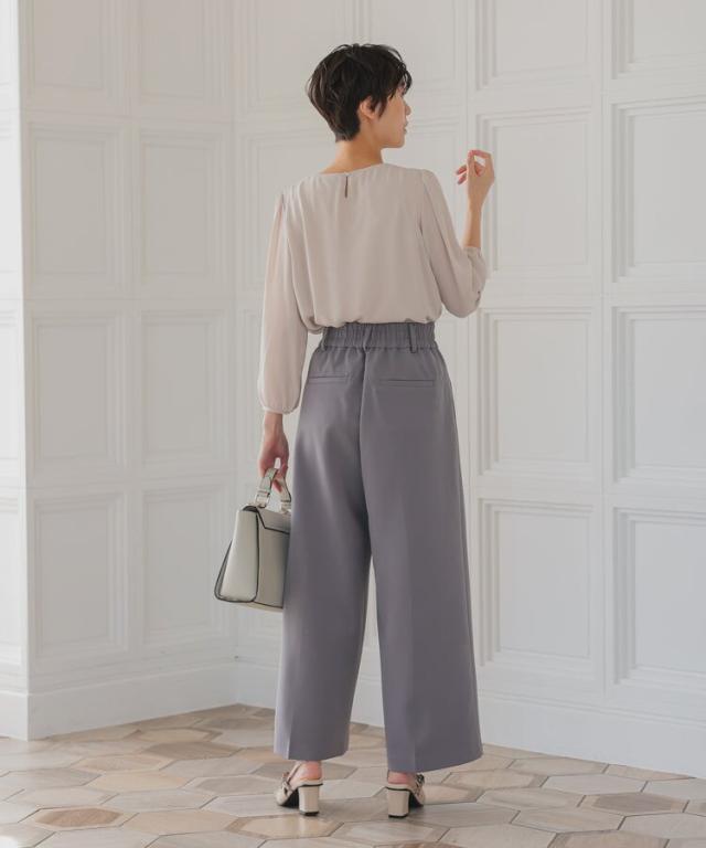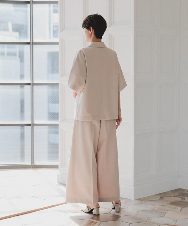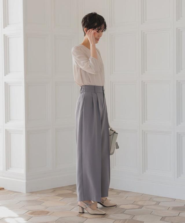 パンツは裾に向かって広がるワイドパンツを使用することで抜け感を演出。