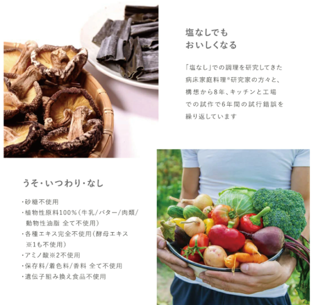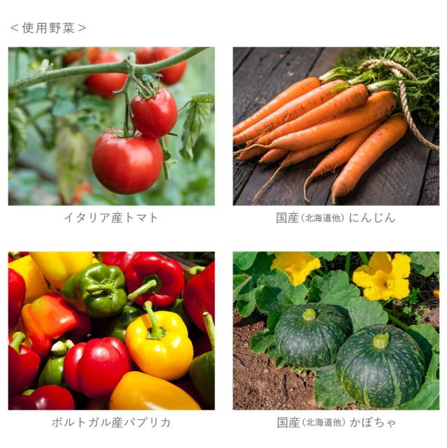 トマトピューレーづけ(トマト(イタリア産))、野菜(人参、キャベツ、玉ねぎ)、ソテーオニオン(玉ねぎ、植物油)、煎り大豆粉末、昆布粉末、椎茸粉末、香辛料、(一部に大豆を含む)