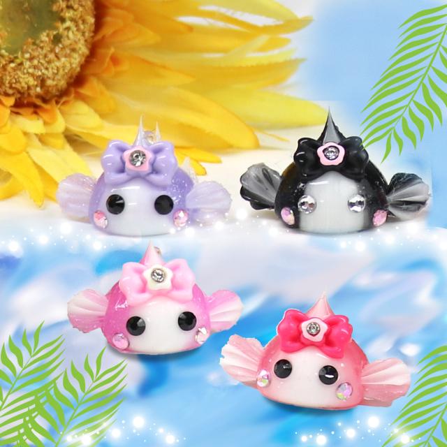 4色のマーブル金魚ほっぺちゃんだよ!尾ひれが動いて今にも泳ぎだしそう♪耳をすませば、泳いでいる音が聞こえてきそうな、金魚ほっぺちゃんたち。赤、ピンク、むらさき、黒と4種類。何色があなたのところに届くかな!お楽しみに!