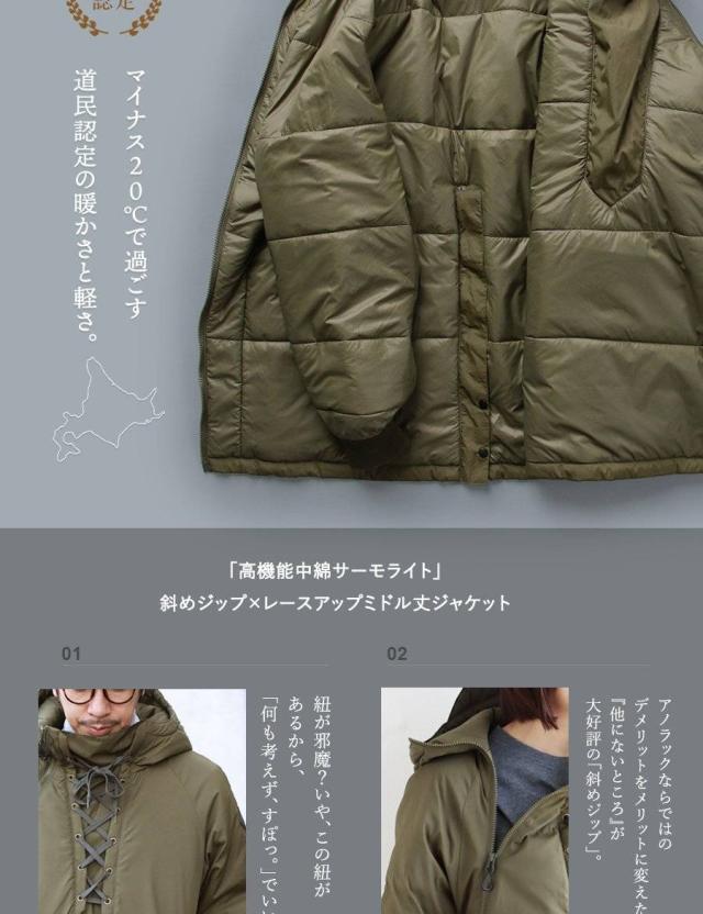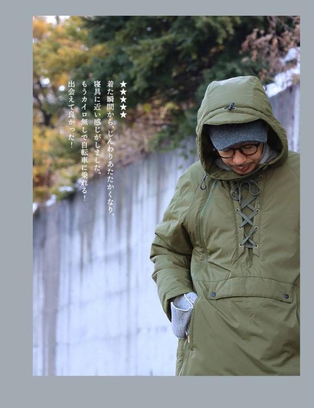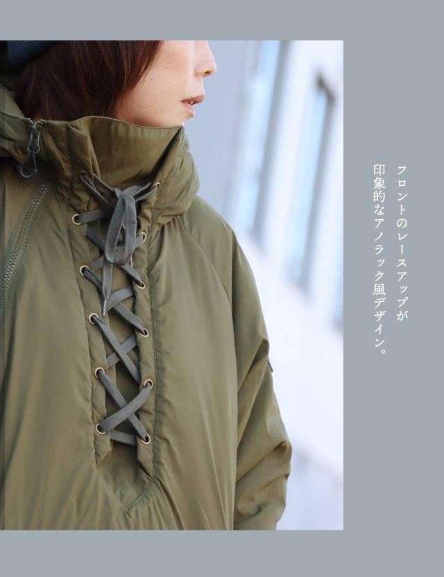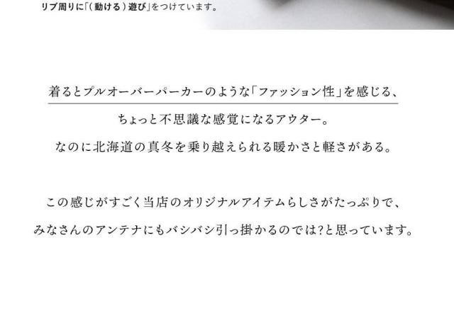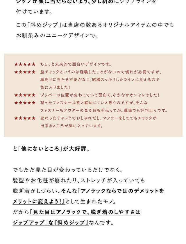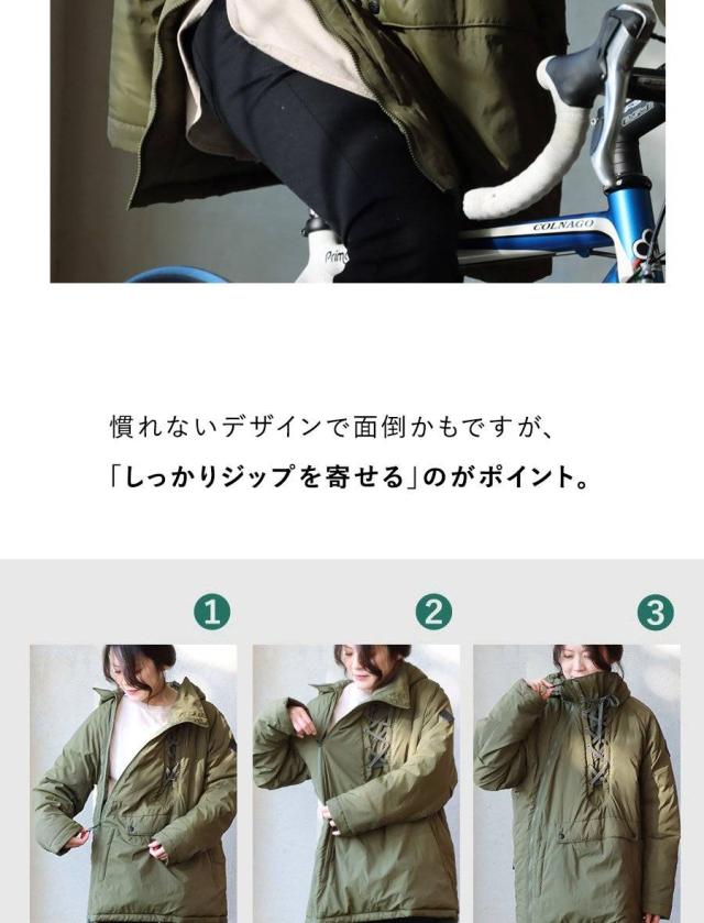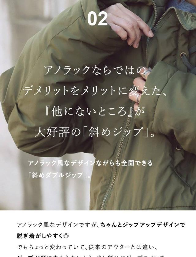 ・アノラック風なデザインながらも全開できる「斜めダブルジップ」。