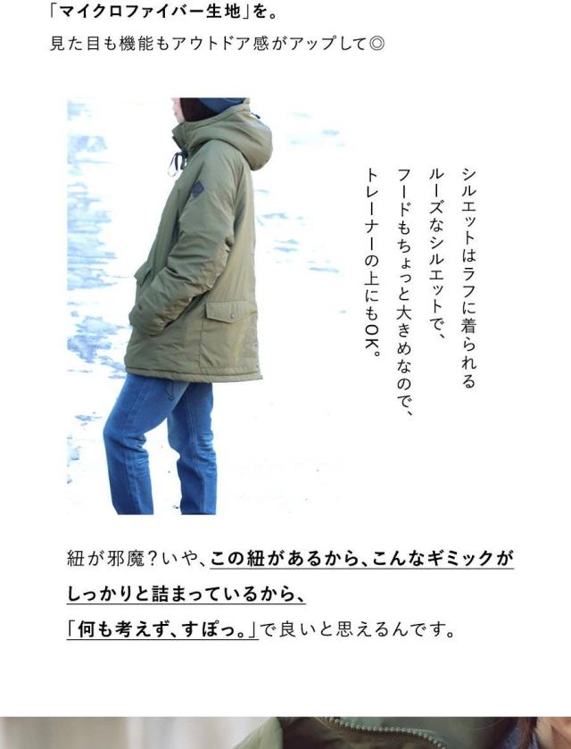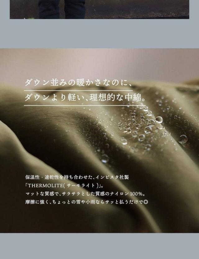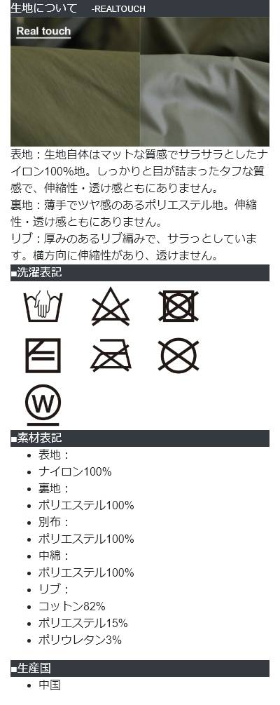 [素材]表地:ナイロン100% 裏地:ポリエステル100% 別布:ポリエステル100% 中綿:ポリエステル100% リブ:コットン82% ポリエステル15% ポリウレタン3%