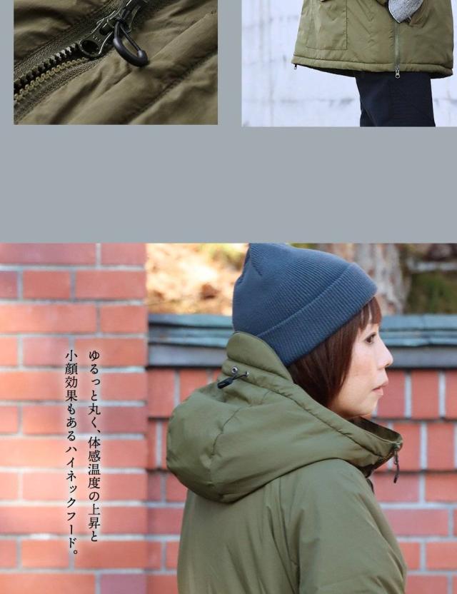 ・ゆるっと丸く、体感温度の上昇と小顔効果もあるハイネックフード。