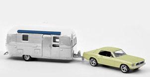 人気のキャンピングトレーラー『エアストリーム』とそれを牽引するマスタングのセット
